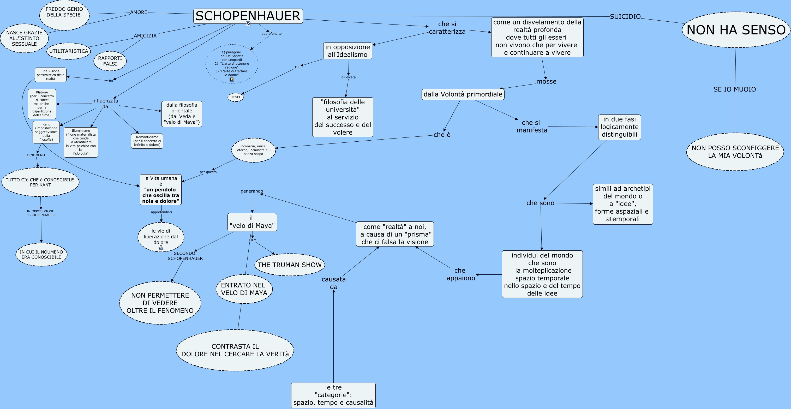 Questa Cmap, creata con IHMC CmapTools, contiene informazioni relative a: schopenahuer, in opposizione all'Idealismo giudicata "filosofia delle università" al servizio del successo e del volere, in due fasi logicamente distinguibili che sono simili ad archetipi del mondo o a "idee", forme aspaziali e atemporali, NON HA SENSO SE IO MUOIO NON POSSO SCONFIGGERE LA MIA VOLONTà, individui del mondo che sono la molteplicazione spazio temporale nello spazio e del tempo delle idee che appaiono come "realtà" a noi, a causa di un "prisma" che ci falsa la visione, TUTTO CIò CHE è CONOSCIBILE PER KANT IN OPPOSIZIONE SCHOPENHAUER IN CUI IL NOUMENO ERA CONOSCIBILE, la Vita umana è "un pendolo che oscilla tra noia e dolore" approfondisci le vie di liberazione dal dolore, SCHOPENHAUER ha una visione pessimistica della realtà, Kant (impostazione soggettivistica della filosofia) FENOMENO TUTTO CIò CHE è CONOSCIBILE PER KANT, in due fasi logicamente distinguibili che sono individui del mondo che sono la molteplicazione spazio temporale nello spazio e del tempo delle idee, dalla Volontà primordiale che si manifesta in due fasi logicamente distinguibili, SCHOPENHAUER AMORE NASCE GRAZIE ALL'ISTINTO SESSUALE, il "velo di Maya" SECONDO SCHOPENHAUER NON PERMETTERE DI VEDERE OLTRE IL FENOMENO, una visione pessimistica della realtà la Vita umana è "un pendolo che oscilla tra noia e dolore", SCHOPENHAUER AMORE FREDDO GENIO DELLA SPECIE, SCHOPENHAUER AMICIZIA UTILITARISTICA, come un disvelamento della realtà profonda dove tutti gli esseri non vivono che per vivere e continuare a vivere mosse dalla Volontà primordiale, il "velo di Maya" FILM THE TRUMAN SHOW, SCHOPENHAUER che si caratterizza in opposizione all'Idealismo, SCHOPENHAUER influenzata da Kant (impostazione soggettivistica della filosofia), SCHOPENHAUER influenzata da Illuminismo (filone materialista che tende a identificare la vita psichica con la fisiologia)