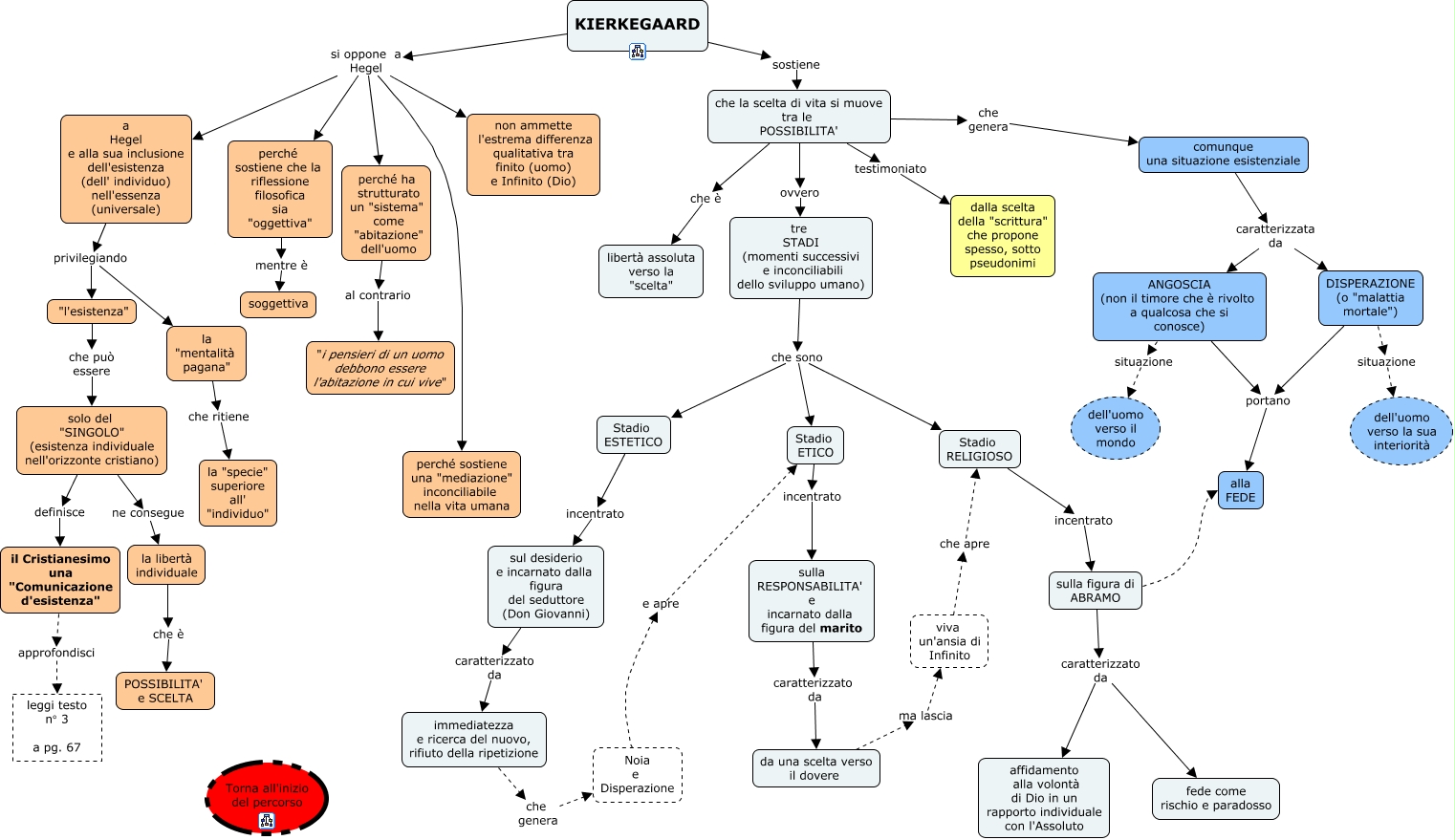 Questa Cmap, creata con IHMC CmapTools, contiene informazioni relative a: Kierkegaard, che la scelta di vita si muove tra le POSSIBILITA' che genera comunque una situazione esistenziale, a Hegel e alla sua inclusione dell'esistenza (dell' individuo) nell'essenza (universale) privilegiando la "mentalità pagana", tre STADI (momenti successivi e inconciliabili dello sviluppo umano) che sono Stadio ESTETICO, KIERKEGAARD si oppone a Hegel perché sostiene una "mediazione" inconciliabile nella vita umana, che la scelta di vita si muove tra le POSSIBILITA' che è libertà assoluta verso la "scelta", sulla RESPONSABILITA' e incarnato dalla figura del marito caratterizzato da da una scelta verso il dovere, Stadio RELIGIOSO incentrato sulla figura di ABRAMO, sulla figura di ABRAMO caratterizzato da fede come rischio e paradosso, sul desiderio e incarnato dalla figura del seduttore (Don Giovanni) caratterizzato da immediatezza e ricerca del nuovo, rifiuto della ripetizione, che la scelta di vita si muove tra le POSSIBILITA' testimoniato dalla scelta della "scrittura" che propone spesso, sotto pseudonimi, ANGOSCIA (non il timore che è rivolto a qualcosa che si conosce) situazione dell'uomo verso il mondo, ANGOSCIA (non il timore che è rivolto a qualcosa che si conosce) portano alla FEDE, la libertà individuale che è POSSIBILITA' e SCELTA, sulla figura di ABRAMO alla FEDE, KIERKEGAARD si oppone a Hegel non ammette l'estrema differenza qualitativa tra finito (uomo) e Infinito (Dio), viva un'ansia di Infinito che apre Stadio RELIGIOSO, la "mentalità pagana" che ritiene la "specie" superiore all' "individuo", KIERKEGAARD si oppone a Hegel perché sostiene che la riflessione filosofica sia "oggettiva", perché sostiene che la riflessione filosofica sia "oggettiva" mentre è soggettiva, "l'esistenza" che può essere solo del "SINGOLO" (esistenza individuale nell'orizzonte cristiano)