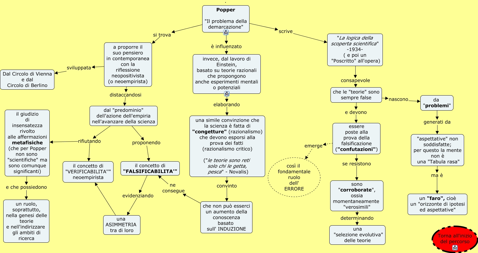 Questa Cmap, creata con IHMC CmapTools, contiene informazioni relative a: popper demarcazione, Popper "Il problema della demarcazione" si trova a proporre il suo pensiero in contemporanea con la riflessione neopositivista (o neoempirista), Popper "Il problema della demarcazione" scrive "La logica della scoperta scientifica" -1934- ( e poi un "Poscritto" all'opera), a proporre il suo pensiero in contemporanea con la riflessione neopositivista (o neoempirista) distaccandosi dal "predominio" dell'azione dell'empiria nell'avanzare della scienza, "La logica della scoperta scientifica" -1934- ( e poi un "Poscritto" all'opera) consapevole che le "teorie" sono sempre false, "aspettative" non soddisfatte; per questo la mente non è una "Tabula rasa" ma è un "faro", cioè un "orizzonte di ipotesi ed aspettative", invece, dal lavoro di Einstein, basato su teorie razionali che propongono anche esperimenti mentali o potenziali elaborando una simile convinzione che la scienza è fatta di "congetture" (razionalismo) che devono esporsi alla prova dei fatti (razionalismo critico) ("le teorie sono reti solo chi le getta, pesca" - Novalis), che le "teorie" sono sempre false nascono da "problemi", sono "corroborate", ossia momentaneamente "verosimili" determinando una "selezione evolutiva" delle teorie, che non può esserci un aumento della conoscenza basato sull' INDUZIONE ne consegue il concetto di "FALSIFICABILITA'", dal "predominio" dell'azione dell'empiria nell'avanzare della scienza rifiutando il concetto di "VERIFICABILITA''" neoempirista, essere poste alla prova della falsificazione ("confutazioni") se resistono sono "corroborate", ossia momentaneamente "verosimili", che le "teorie" sono sempre false e devono essere poste alla prova della falsificazione ("confutazioni"), una ASIMMETRIA tra di loro il concetto di "VERIFICABILITA''" neoempirista, da "problemi" generati da "aspettative" non soddisfatte; per questo la mente non è una "Tabula rasa", a proporre il suo pensiero in contemporanea con la riflessione neopositivista (o neoempirista) sviluppata Dal Circolo di Vienna e dal Circolo di Berlino, essere poste alla prova della falsificazione ("confutazioni") emerge così il fondamentale ruolo dell' ERRORE, il concetto di "FALSIFICABILITA'" evidenziando una ASIMMETRIA tra di loro, dal "predominio" dell'azione dell'empiria nell'avanzare della scienza rifiutando il giudizio di insensatezza rivolto alle affermazioni metafisiche (che per Popper non sono "scientifiche" ma sono comunque significanti), Popper "Il problema della demarcazione" è influenzato invece, dal lavoro di Einstein, basato su teorie razionali che propongono anche esperimenti mentali o potenziali, dal "predominio" dell'azione dell'empiria nell'avanzare della scienza proponendo il concetto di "FALSIFICABILITA'"