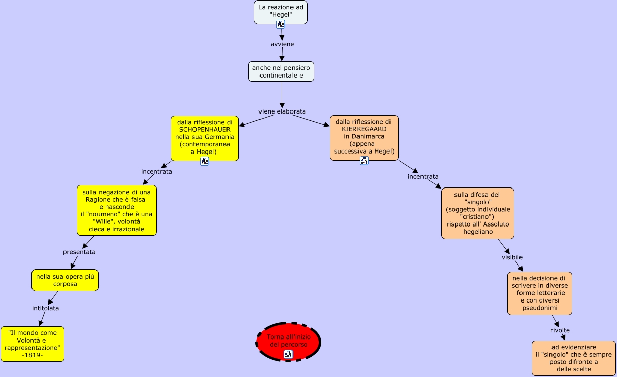 Questa Cmap, creata con IHMC CmapTools, contiene informazioni relative a: reazione a Hegel, La reazione ad "Hegel" avviene anche nel pensiero continentale e, anche nel pensiero continentale e viene elaborata dalla riflessione di SCHOPENHAUER nella sua Germania (contemporanea a Hegel), nella sua opera più corposa intitolata "Il mondo come Volontà e rappresentazione" -1819-, nella decisione di scrivere in diverse forme letterarie e con diversi pseudonimi rivolte ad evidenziare il "singolo" che è sempre posto difronte a delle scelte, sulla difesa del "singolo" (soggetto individuale "cristiano") rispetto all' Assoluto hegeliano visibile nella decisione di scrivere in diverse forme letterarie e con diversi pseudonimi, dalla riflessione di KIERKEGAARD in Danimarca (appena successiva a Hegel) incentrata sulla difesa del "singolo" (soggetto individuale "cristiano") rispetto all' Assoluto hegeliano, dalla riflessione di SCHOPENHAUER nella sua Germania (contemporanea a Hegel) incentrata sulla negazione di una Ragione che è falsa e nasconde il "noumeno" che è una "Wille", volontà cieca e irrazionale, sulla negazione di una Ragione che è falsa e nasconde il "noumeno" che è una "Wille", volontà cieca e irrazionale presentata nella sua opera più corposa, anche nel pensiero continentale e viene elaborata dalla riflessione di KIERKEGAARD in Danimarca (appena successiva a Hegel)