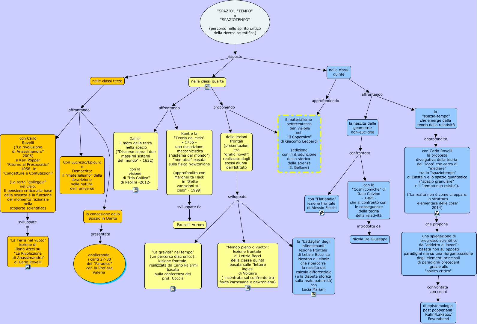 Questa Cmap, creata con IHMC CmapTools, contiene informazioni relative a: SPAZIO -TEMPO e SPAZIOTEMPO 2014-15, la concezione dello Spazio in Dante presentata analizzando i canti 27-30 del "Paradiso" con la Prof.ssa Valeria, nelle classi terze affrontando Con Lucrezio/Epicuro e Democrito: il "materialismo" della descrizione nella natura dell' universo, "SPAZIO", "TEMPO" e "SPAZIOTEMPO" (percorso nello spirito critico della ricerca scientifica) esposto nelle classi quinte, con le "Cosmicomiche" di Italo Calvino - 1965 - che si confrontò con le conseguenze della teoria della relatività introdotte da Nicola De Giuseppe, nelle classi quarte proponendo delle lezioni frontali (presentazioni e/o "grafic novel") realizzate dagli stessi alunni dell'Istituto, nelle classi quinte approfondendo il materialismo settecentesco ben visibile nel "Il Copernico" di Giacomo Leopardi (edizione con l'introdunzione delllo storico della scienza E. Bellone), con Carlo Rovelli ("La rivoluzione di Anassimandro" 2005) e Karl Popper "Ritorno ai Presocratici" -1958- in "Congetture e Confutazioni" (La terra "galleggia" nel cielo. Il pensiero critico alla base della scienza e la funzione del momento razionale nella scoperta scientifica) sviluppate in "La Terra nel vuoto" lezione di Ilaria Atzei su "La Rivoluzione di Anassimandro" di Carlo Rovelli, nelle classi quinte affrontando lo "spazio-tempo" che emerge dalla teoria della relatività, la nascita delle geometrie non-euclidee confrontato con "Flatlandia" lezione frontale di Alessio Fecchi, delle lezioni frontali (presentazioni e/o "grafic novel") realizzate dagli stessi alunni dell'Istituto sviluppate in la "battaglia" degli infinesimanli: lezione frontale di Letizia Bocci su Newton e Leibniz che ripercorre la nascita del calcolo differenziale (e la disputa storica sulla reale paternità) con Lucia Mariani, "SPAZIO", "TEMPO" e "SPAZIOTEMPO" (percorso nello spirito critico della ricerca scientifica) esposto nelle classi terze, nelle classi quarte proponendo il materialismo settecentesco ben visibile nel "Il Copernico" di Giacomo Leopardi (edizione con l'introdunzione delllo storico della scienza E. Bellone), nelle classi terze affrontando la concezione dello Spazio in Dante, nelle classi quinte affrontando la nascita delle geometrie non-euclidee, "SPAZIO", "TEMPO" e "SPAZIOTEMPO" (percorso nello spirito critico della ricerca scientifica) esposto nelle classi quarte, nelle classi quarte affrontando Kant e la "Teoria del cielo" - 1756 - una descrizione meccanicistica ("sistema del mondo") "non atea" basata sulla fisica Newtoniana (approfondita con Margherita Hack in "Sette variazioni sul cielo" - 1999), nelle classi terze affrontando con Carlo Rovelli ("La rivoluzione di Anassimandro" 2005) e Karl Popper "Ritorno ai Presocratici" -1958- in "Congetture e Confutazioni" (La terra "galleggia" nel cielo. Il pensiero critico alla base della scienza e la funzione del momento razionale nella scoperta scientifica), nelle classi quarte affrontando Galilei il moto della terra nella spazio ("Discorso sopra i due massimi sistemi del mondo" - 1632) con la visione di "Itis Galileo" di Paolini -2012-, con Carlo Rovelli la proposta divulgativa della teoria dei "loop" che cerca di "mediare" tra lo "spaziotempo" di Einstein e lo spazio quantistico ("spazio granulare" e il "tempo non esiste"). ("La realtà non è come ci appare. La struttura elementare delle cose" 2014) che propone una spiegazione di progresso scientifico da "addetto ai lavori": basata non su opposti paradigmi ma su una riorganizzazione degli elementi principali di paradigmi precedenti grazie allo "spirito critico"., una spiegazione di progresso scientifico da "addetto ai lavori": basata non su opposti paradigmi ma su una riorganizzazione degli elementi principali di paradigmi precedenti grazie allo "spirito critico". confrontata con cenni di epistemologia post popperiana: Kuhn/Lakatos/ Feyerabend