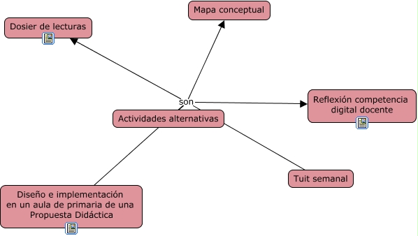 Este Cmap, tiene información relacionada con: actividades, Actividades alternativas son Mapa conceptual, Actividades alternativas son Dosier de lecturas, Actividades alternativas son Tuit semanal, Actividades alternativas son Diseño e implementación en un aula de primaria de una Propuesta Didáctica, Actividades alternativas son Reflexión competencia digital docente