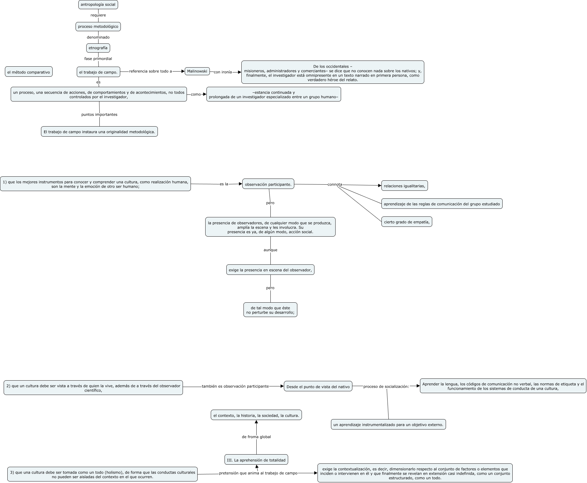 Este Cmap, tiene información relacionada con: ETNO Trabajo de campo, Desde el punto de vista del nativo proceso de socialización: Aprender la lengua, los códigos de comunicación no verbal, las normas de etiqueta y el funcionamiento de los sistemas de conducta de una cultura,, un proceso, una secuencia de acciones, de comportamientos y de acontecimientos, no todos controlados por el investigador, como –estancia continuada y prolongada de un investigador especializado entre un grupo humano–, observación participante. pero la presencia de observadores, de cualquier modo que se produzca, amplía la escena y les involucra. Su presencia es ya, de algún modo, acción social., 3) que una cultura debe ser tomada como un todo (holismo), de forma que las conductas culturales no pueden ser aisladas del contexto en el que ocurren. pretensión que anima al trabajo de campo III. La aprehensión de totalidad, exige la presencia en escena del observador, pero de tal modo que éste no perturbe su desarrollo;, el trabajo de campo. referencia sobre todo a Malinowski, proceso metodológico denominado etnografía, 3) que una cultura debe ser tomada como un todo (holismo), de forma que las conductas culturales no pueden ser aisladas del contexto en el que ocurren. pretensión que anima al trabajo de campo exige la contextualización, es decir, dimensionarlo respecto al conjunto de factores o elementos que inciden o intervienen en él y que finalmente se revelan en extensión casi indefinida, como un conjunto estructurado, como un todo., observación participante. connota cierto grado de empatía,, etnografía fase primordial el trabajo de campo., Malinowski con ironía De los occidentales – misioneros, administradores y comerciantes– se dice que no conocen nada sobre los nativos; y, finalmente, el investigador está omnipresente en un texto narrado en primera persona, como verdadero héroe del relato., III. La aprehensión de totalidad de froma global el contexto, la historia, la sociedad, la cultura., 2) que un cultura debe ser vista a través de quien la vive, además de a través del observador científico, también es observación participante Desde el punto de vista del nativo, Desde el punto de vista del nativo proceso de socialización: un aprendizaje instrumentalizado para un objetivo externo., el trabajo de campo. es un proceso, una secuencia de acciones, de comportamientos y de acontecimientos, no todos controlados por el investigador,, la presencia de observadores, de cualquier modo que se produzca, amplía la escena y les involucra. Su presencia es ya, de algún modo, acción social. aunque exige la presencia en escena del observador,, antropología social requiere proceso metodológico, observación participante. connota relaciones igualitarias,, un proceso, una secuencia de acciones, de comportamientos y de acontecimientos, no todos controlados por el investigador, puntos importantes El trabajo de campo instaura una originalidad metodológica., 1) que los mejores instrumentos para conocer y comprender una cultura, como realización humana, son la mente y la emoción de otro ser humano; es la observación participante.