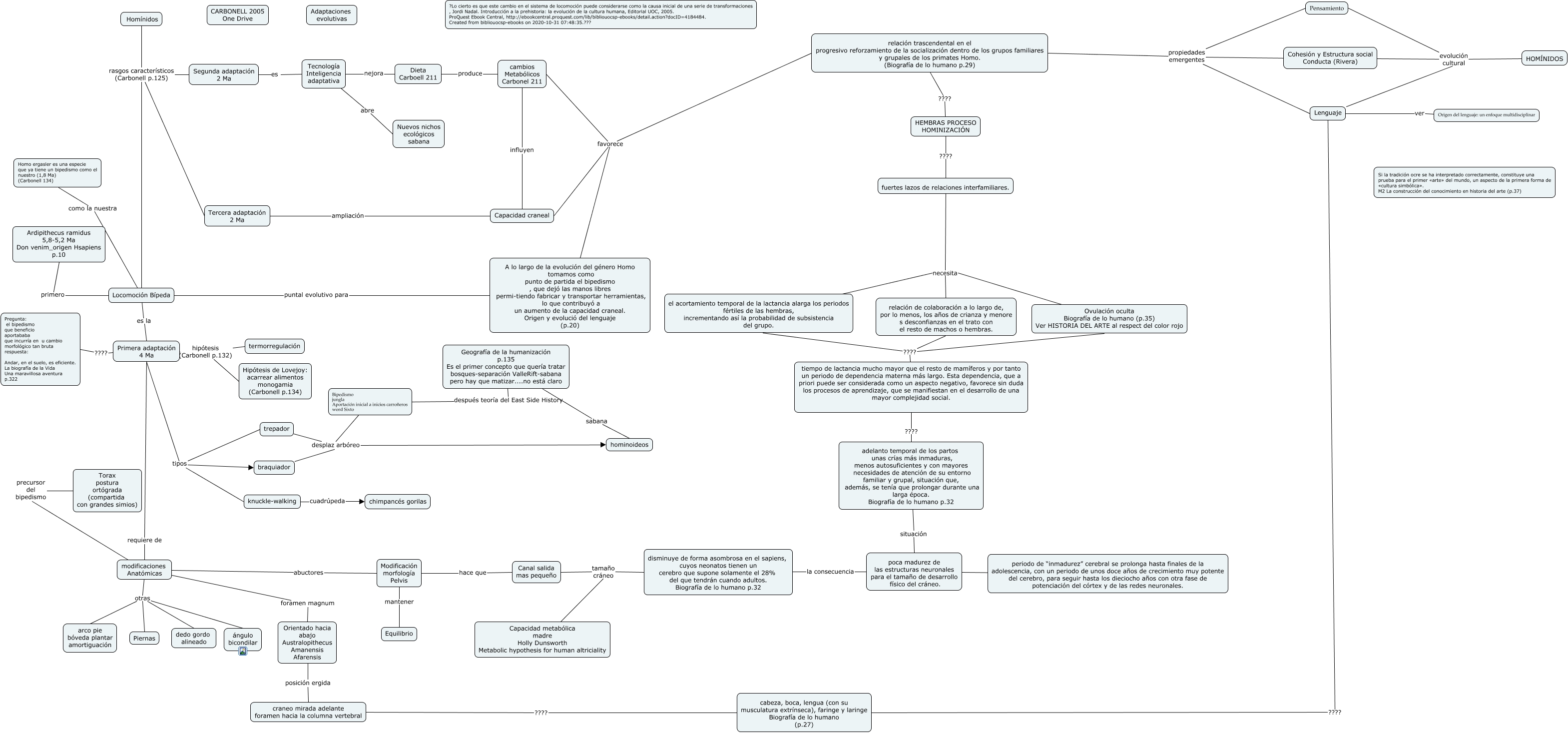 Este Cmap, tiene información relacionada con: BIPEDISMO ANTROPOLOGÍA, Capacidad metabólica madre Holly Dunsworth Metabolic hypothesis for human altriciality tamaño cráneo disminuye de forma asombrosa en el sapiens, cuyos neonatos tienen un cerebro que supone solamente el 28% del que tendrán cuando adultos. Biografía de lo humano p.32, Modificación morfología Pelvis mantener Equilibrio, tiempo de lactancia mucho mayor que el resto de mamíferos y por tanto un periodo de dependencia materna más largo. Esta dependencia, que a priori puede ser considerada como un aspecto negativo, favorece sin duda los procesos de aprendizaje, que se manifiestan en el desarrollo de una mayor complejidad social. ???? relación de colaboración a lo largo de, por lo menos, los años de crianza y menore s desconfianzas en el trato con el resto de machos o hembras., modificaciones Anatómicas otras ángulo bicondilar, relación trascendental en el progresivo reforzamiento de la socialización dentro de los grupos familiares y grupales de los primates Homo. (Biografía de lo humano p.29) propiedades emergentes Cohesión y Estructura social Conducta (Rivera), Locomoción Bípeda como la nuestra Homo ergasler es una especie que ya tiene un bipedismo como el nuestro (1,8 Ma) (Carbonell 134), Locomoción Bípeda es la Primera adaptación 4 Ma, Segunda adaptación 2 Ma es Tecnología Inteligencia adaptativa, relación trascendental en el progresivo reforzamiento de la socialización dentro de los grupos familiares y grupales de los primates Homo. (Biografía de lo humano p.29) propiedades emergentes Pensamiento, Primera adaptación 4 Ma tipos knuckle-walking, Cohesión y Estructura social Conducta (Rivera) evolución cultural Pensamiento, disminuye de forma asombrosa en el sapiens, cuyos neonatos tienen un cerebro que supone solamente el 28% del que tendrán cuando adultos. Biografía de lo humano p.32 la consecuencia poca madurez de las estructuras neuronales para el tamaño de desarrollo físico del cráneo., Homínidos rasgos característicos (Carbonell p.125) Tercera adaptación 2 Ma, Geografía de la humanización p.135 Es el primer concepto que quería tratar bosques-separación ValleRift-sabana pero hay que matizar....no está claro sabana hominoideos, Canal salida mas pequeño tamaño cráneo disminuye de forma asombrosa en el sapiens, cuyos neonatos tienen un cerebro que supone solamente el 28% del que tendrán cuando adultos. Biografía de lo humano p.32, Geografía de la humanización p.135 Es el primer concepto que quería tratar bosques-separación ValleRift-sabana pero hay que matizar....no está claro después teoría del East Side History Bipedismo jungla Aportación inicial a inicios carroñeros word Sixto, Origen del lenguaje: un enfoque multidisciplinar ver Lenguaje, modificaciones Anatómicas precursor del bipedismo Torax postura ortógrada (compartida con grandes simios), tiempo de lactancia mucho mayor que el resto de mamíferos y por tanto un periodo de dependencia materna más largo. Esta dependencia, que a priori puede ser considerada como un aspecto negativo, favorece sin duda los procesos de aprendizaje, que se manifiestan en el desarrollo de una mayor complejidad social. ???? Ovulación oculta Biografía de lo humano (p.35) Ver HISTORIA DEL ARTE al respect del color rojo, modificaciones Anatómicas abuctores Modificación morfología Pelvis