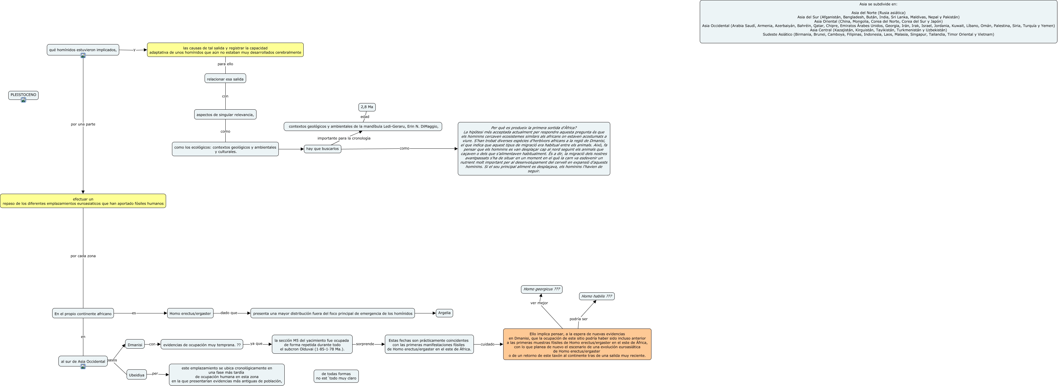 Este Cmap, tiene información relacionada con: DIÁSPORA, evidencias de ocupación muy temprana. ?? ya que la sección M5 del yacimiento fue ocupada de forma repetida durante todo el subcron Olduvai (1·85-1·78 Ma.)., Homo erectus/ergaster dado que presenta una mayor distribución fuera del foco principal de emergencia de los homínidos, Dmanisi con evidencias de ocupación muy temprana. ??, Estas fechas son prácticamente coincidentes con las primeras manifestaciones fósiles de Homo erectus/ergaster en el este de África. cuidado Ello implica pensar, a la espera de nuevas evidencias en Dmanisi, que la ocupación de este sitio podría haber sido incluso anterior a las primeras muestras fósiles de Homo erectus/ergaster en el este de África, con lo que planea de nuevo el escenario de una evolución euroasiática de Homo erectus/ergaster o de un retorno de este taxón al continente tras de una salida muy reciente., presenta una mayor distribución fuera del foco principal de emergencia de los homínidos ???? Argelia, la sección M5 del yacimiento fue ocupada de forma repetida durante todo el subcron Olduvai (1·85-1·78 Ma.). sorprende Estas fechas son prácticamente coincidentes con las primeras manifestaciones fósiles de Homo erectus/ergaster en el este de África., Ello implica pensar, a la espera de nuevas evidencias en Dmanisi, que la ocupación de este sitio podría haber sido incluso anterior a las primeras muestras fósiles de Homo erectus/ergaster en el este de África, con lo que planea de nuevo el escenario de una evolución euroasiática de Homo erectus/ergaster o de un retorno de este taxón al continente tras de una salida muy reciente. ver mejor Homo georgicus ???, aspectos de singular relevancia, como como los ecológicos: contextos geológicos y ambientales y culturales., como los ecológicos: contextos geológicos y ambientales y culturales. pero hay que buscarlos, al sur de Asia Occidental pasos Ubeidiya, relacionar esa salida con aspectos de singular relevancia,, 2,8 Ma edad contextos geológicos y ambientales de la mandíbula Ledi-Geraru, Erin N. DiMaggio,, En el propio continente africano es Homo erectus/ergaster, las causas de tal salida y registrar la capacidad adaptativa de unos homínidos que aún no estaban muy desarrollados cerebralmente para ello relacionar esa salida, hay que buscarlos como Per què es produeix la primera sortida d'Àfrica? La hipòtesi més acceptada actualment per respondre aquesta pregunta és que els hominins cercaven ecosistemes similars als africans on estaven acostumats a viure. S'han trobat diverses espècies d'herbívors africans a la regió de Dmanisi, el que indica que aquest tipus de migració era habitual entre els animals. Això, fa pensar que els hominins es van desplaçar cap al nord seguint els animals que caçaven o dels que s'alimentaven habitualment. És a dir, la migració dels nostres avantpassats s'ha de situar en un moment en el què la carn va esdevenir un nutrient molt important per al desenvolupament del cervell en expansió d'aquests hominins. Si el seu principal aliment es desplaçava, els hominins l'havien de seguir., al sur de Asia Occidental pasos Dmanisi, qué homínidos estuvieron implicados, y las causas de tal salida y registrar la capacidad adaptativa de unos homínidos que aún no estaban muy desarrollados cerebralmente, hay que buscarlos importante para la cronologìa contextos geológicos y ambientales de la mandíbula Ledi-Geraru, Erin N. DiMaggio,, Ubeidiya per este emplazamiento se ubica cronológicamente en una fase más tardía de ocupación humana en esta zona en la que presentarían evidencias más antiguas de población,, En el propio continente africano en al sur de Asia Occidental