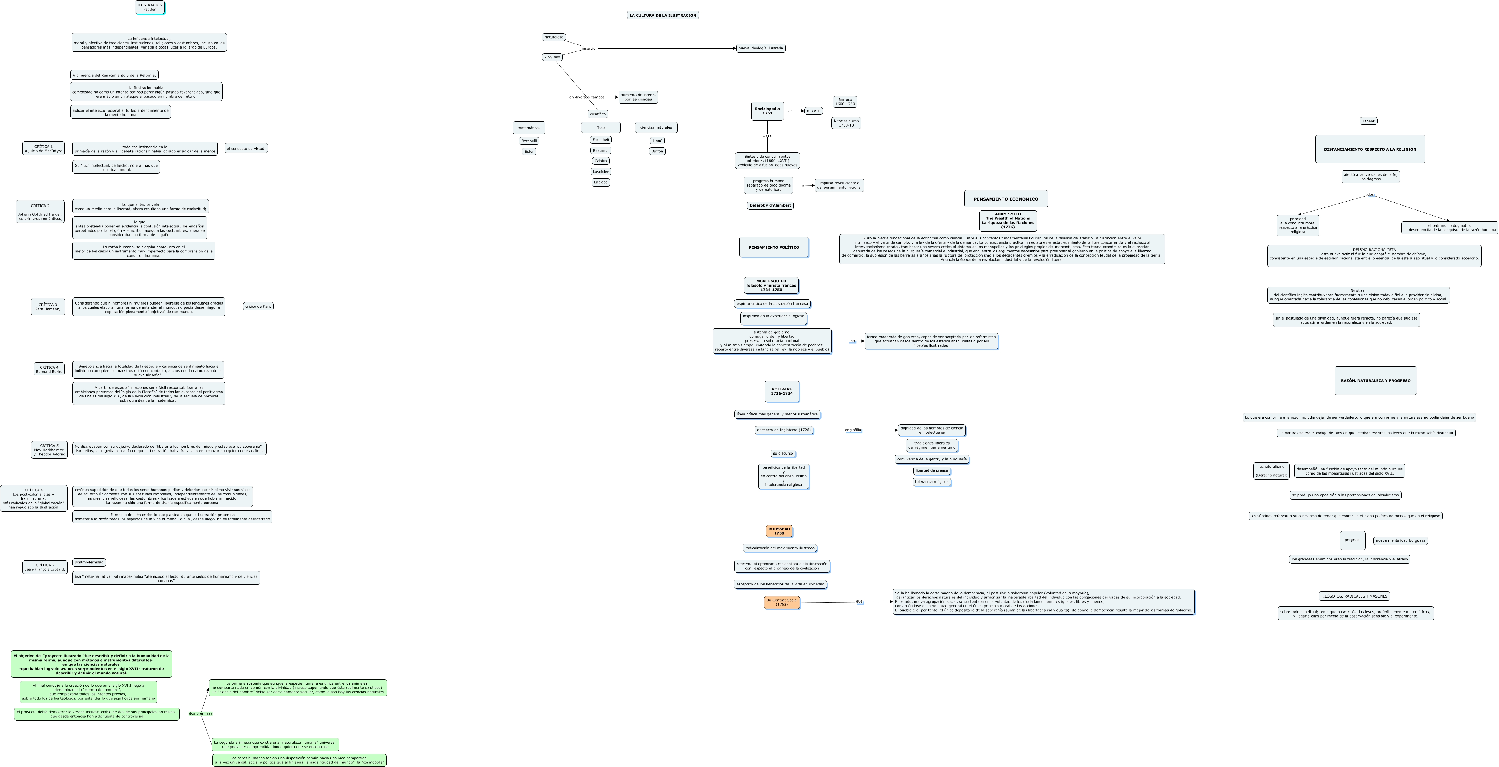 Este Cmap, tiene información relacionada con: PEC4 H M, progreso en diversos campos aumento de interés por las ciencias, afectó a las verdades de la fe, los dogmas dos prioridad a la conducta moral respecto a la práctica religiosa, Naturaleza inserción nueva ideología ilustrada, progreso humano separado de todo dogma y de autoridad e impulso revolucionario del pensamiento racional, Enciclopedia 1751 en s. XVIII, progreso inserción nueva ideología ilustrada, destierro en Inglaterra (1726) anglofilia dignidad de los hombres de ciencia e intelectuales, El proyecto debía demostrar la verdad incuestionable de dos de sus principales premisas, que desde entonces han sido fuente de controversia dos premisas La primera sostenía que aunque la especie humana es única entre los animales, no comparte nada en común con la divinidad (incluso suponiendo que ésta realmente existiese). La “ciencia del hombre” debía ser decididamente secular, como lo son hoy las ciencias naturales, El proyecto debía demostrar la verdad incuestionable de dos de sus principales premisas, que desde entonces han sido fuente de controversia dos premisas La segunda afirmaba que existía una “naturaleza humana” universal que podía ser comprendida donde quiera que se encontrase, Du Contrat Social (1762) que Se la ha llamado la carta magna de la democracia, al postular la soberanía popular (voluntad de la mayoría), garantizar los derechos naturales del individuo y armonizar la inalterable libertad del individuo con las obligaciones derivadas de su incorporación a la sociedad. El estado, nueva agrupación social, se sustentaba en la voluntad de los ciudadanos hombres iguales, libres y buenos, convirtiéndose en la voluntad general en el único principio moral de las acciones. El pueblo era, por tanto, el único depositario de la soberanía (suma de las libertades individuales), de donde la democracia resulta la mejor de las formas de gobierno., afectó a las verdades de la fe, los dogmas dos el patrimonio dogmático se desentendíia de la conquista de la razón humana, progreso en diversos campos científico, Enciclopedia 1751 como Síntesis de conocimientos anteriores (1600 s.XVII) vehículo de difusión ideas nuevas, sistema de gobierno conjugar orden y libertad preserva la soberanía nacional y al mismo tiempo, evitando la concentración de poderes: reparto entre diversas instancias (el rey, la nobleza y el pueblo) una forma moderada de gobierno, capaz de ser aceptada por los reformistas que actuaban desde dentro de los estados absolutistas o por los filósofos ilustrrados