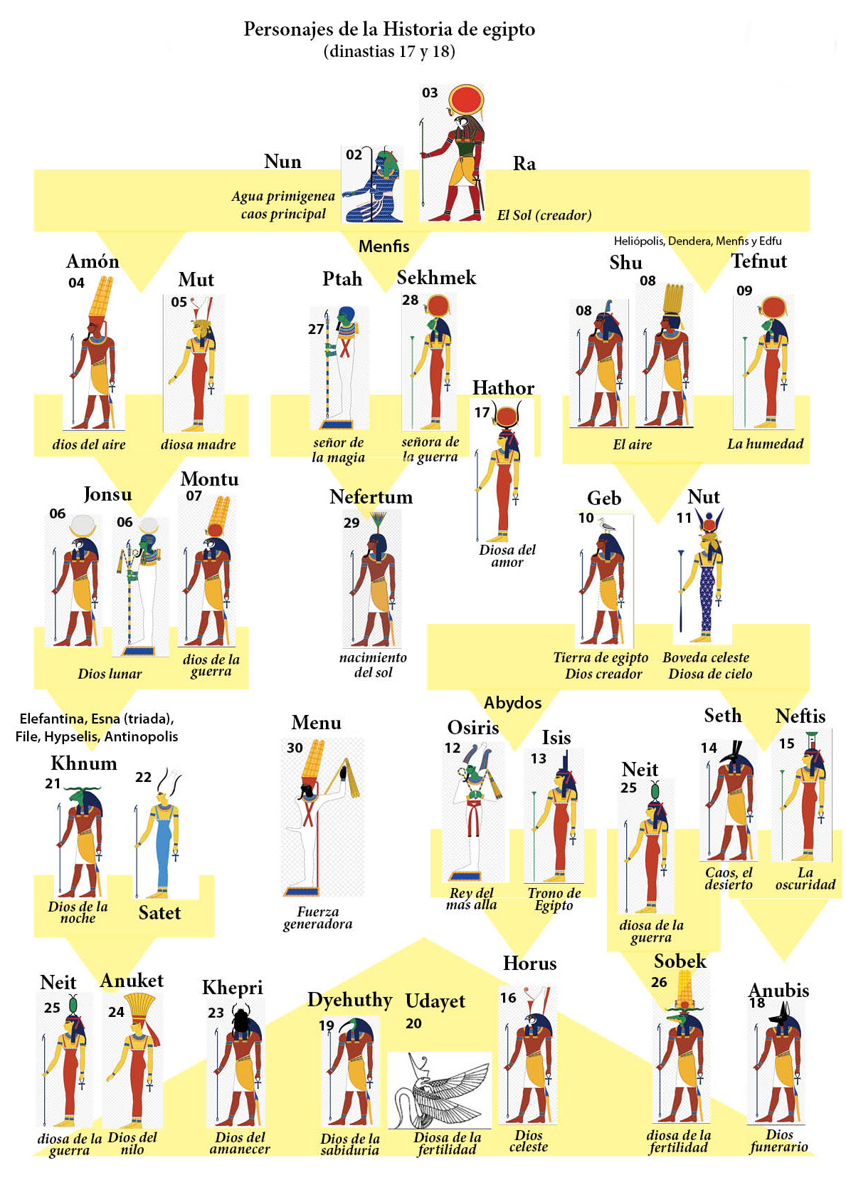 COSMOGONÍA HELIO NUT GEB SHU RA.png Cosmogonía Heliopolitana jerarquía Enéada.png panteon-egipcio.jpg