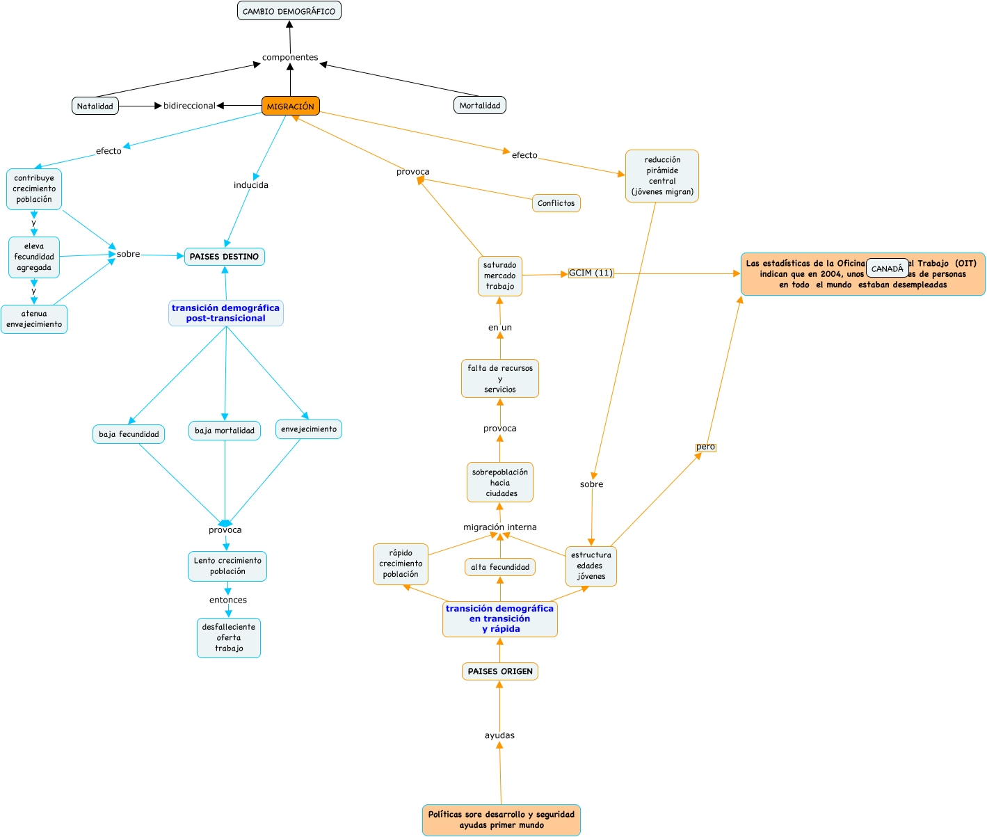 Este Cmap, tiene información relacionada con: MIGRACIÓN, alta fecundidad migración interna sobrepoblación hacia ciudades, reducción pirámide central (jóvenes migran) sobre estructura edades jóvenes, falta de recursos y servicios en un saturado mercado trabajo, Mortalidad componentes CAMBIO DEMOGRÁFICO, eleva fecundidad agregada y atenua envejecimiento, MIGRACIÓN inducida PAISES DESTINO, saturado mercado trabajo GCIM (11) Las estadísticas de la Oficina Interna del Trabajo (OIT) indican que en 2004, unos 185 millones de personas en todo el mundo estaban desempleadas, envejecimiento provoca Lento crecimiento población, contribuye crecimiento población sobre PAISES DESTINO, PAISES ORIGEN transición demográfica en transición y rápida rápido crecimiento población, Lento crecimiento población entonces desfalleciente oferta trabajo, estructura edades jóvenes migración interna sobrepoblación hacia ciudades, MIGRACIÓN efecto contribuye crecimiento población, MIGRACIÓN componentes CAMBIO DEMOGRÁFICO, PAISES ORIGEN transición demográfica en transición y rápida alta fecundidad, eleva fecundidad agregada sobre PAISES DESTINO, rápido crecimiento población migración interna sobrepoblación hacia ciudades, Políticas sore desarrollo y seguridad ayudas primer mundo ayudas PAISES ORIGEN, sobrepoblación hacia ciudades provoca falta de recursos y servicios, Natalidad componentes CAMBIO DEMOGRÁFICO