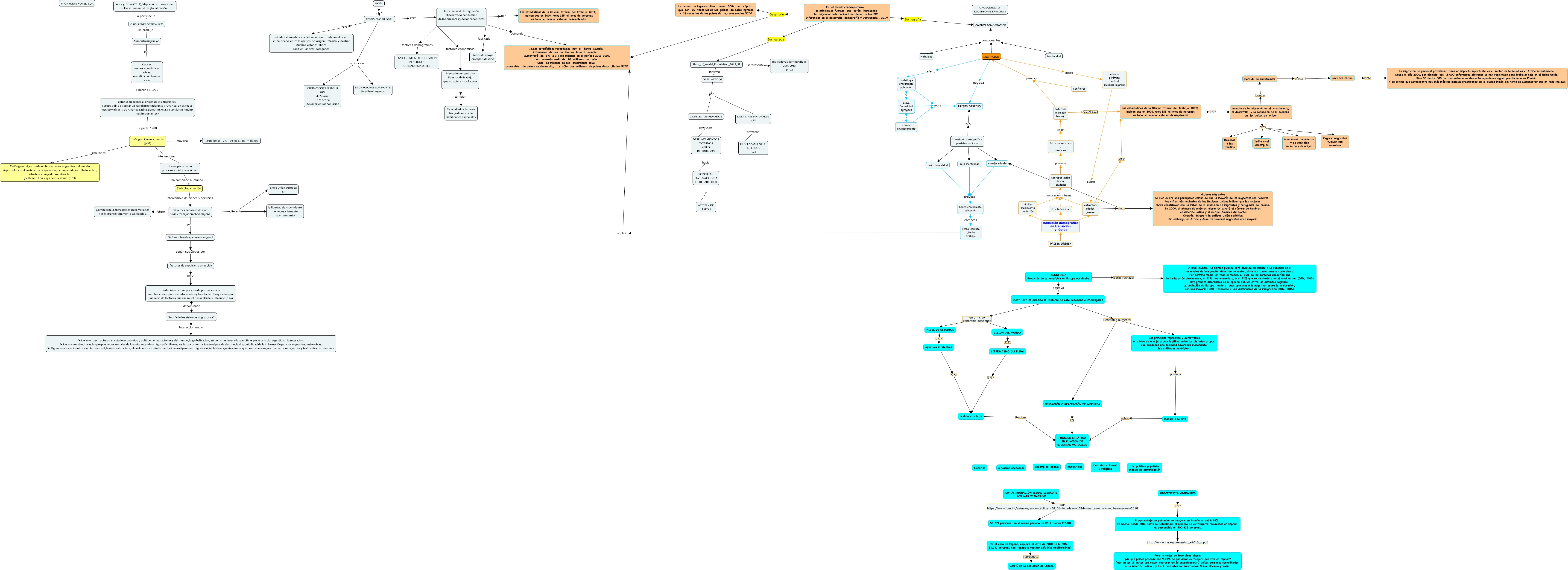 Este Cmap, tiene información relacionada con: MIGRACIÓN NORTE-SUR, FENÓMENO GLOBAL distribución MIGRACIONES SUR-SUR 40% 49 M Asia 16 M Africa 6M America Latina Caribe, servicios claves dato La migración de personal profesional tiene un impacto importante en el sector de la salud en el Africa subsahariana. Desde el año 2000, por ejemplo, casi 16.000 enfermeras africanas se han registrado para trabajar solo en el Reino Unido. Sólo 50 de los 600 doctors entrenados desde Independence siguen practicando en Zambia. Y se estima que actualmente hay más médicos malauis practicando en la ciudad inglés del norte de Manchester que en toda Malawi., LIBERALISMO CULTURAL ???? modula a la baja, contribuye crecimiento población y eleva fecundidad agregada, En el mundo contemporáneo, las principales fuerzas que están impulsando la migración internacional se deben a los '3D': Diferencias en el desarrollo, demografía y Democracia . GCIM Desarrollo los países de ingresos altos tienen GDPs per cápita que son 66 veces los de los países de bajos ingresos y 14 veces los de los países de ingresos medios.GCIM, Imortancia de la migración al desarrollo económico de los emisores y de los receptores factores demográficos ENVEJECIMIENTO POBLACIÓN: PENSIONES CUIDADO MAYORES, MIGRACIÓN componentes CAMBIO DEMOGRÁFICO, identificar los principales factores de este fenómeno e interrogarse xenofobia aumenta SENSACIÓN O PERCEPCIÓN DE AMENAZA, 1º=Migración en aumento (p.37) internacional forma parte de un proceso social y económico, Imortancia de la migración al desarrollo económico de los emisores y de los receptores por Las estadísticas de la Oficina Interna del Trabajo (OIT) indican que en 2004, unos 185 millones de personas en todo el mundo estaban desempleadas, modula a la alta sobre PROCESO ERRÁTICO EN FUNCIÓN DE DIVERSAS VARIABLES, 1º=Migración en aumento (p.37) moviliza 190 millones —3%— de los 6.7 mil millones, CRISIS ENERGÉTICA 1973 se produjo Aumento migración, forma parte de un proceso social y económico ha cambiado al mundo 3º=la globalización, Aumento migración por Causas menos económicas otras: reunificación familiar asilo, estructura edades jóvenes pero Las estadísticas de la Oficina Interna del Trabajo (OIT) indican que en 2004, unos 185 millones de personas en todo el mundo estaban desempleadas, estructura edades jóvenes migración interna sobrepoblación hacia ciudades, identificar los principales factores de este fenómeno e interrogarse en principo xenofobia desciende NIVEL DE ESTUDIOS, falta de recursos y servicios en un saturado mercado trabajo, más y más personas desean vivir y trabajar en el extranjero diferente Entre Unión Europea SI