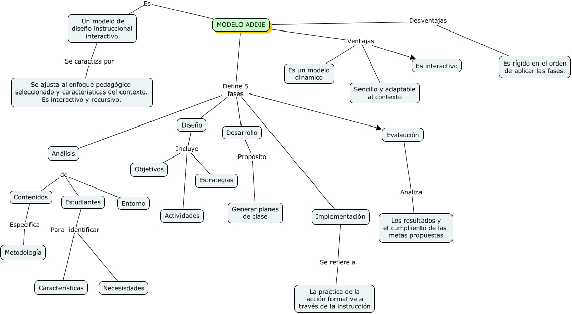 Este Cmap, tiene información relacionada con: MODELO ADDIE, Diseño Incluye Objetivos, MODELO ADDIE Define 5 fases Diseño, Análisis de Entorno, Contenidos Especifica Metodología, MODELO ADDIE Define 5 fases Evalaución, MODELO ADDIE Define 5 fases Análisis, MODELO ADDIE Es Un modelo de diseño instruccional interactivo, Estudiantes Para identificar Características, Evalaución Analiza Los resultados y el cumpliiento de las metas propuestas, MODELO ADDIE Ventajas Es interactivo, Implementación Se refiere a La practica de la acción formativa a través de la instrucción, Análisis de Estudiantes, Diseño Incluye Estrategias, Análisis de Contenidos, Desarrollo Propósito Generar planes de clase, MODELO ADDIE Desventajas Es rígido en el orden de aplicar las fases., MODELO ADDIE Ventajas Sencillo y adaptable al contexto, Diseño Incluye Actividades, MODELO ADDIE Define 5 fases Implementación, MODELO ADDIE Ventajas Es un modelo dinamico