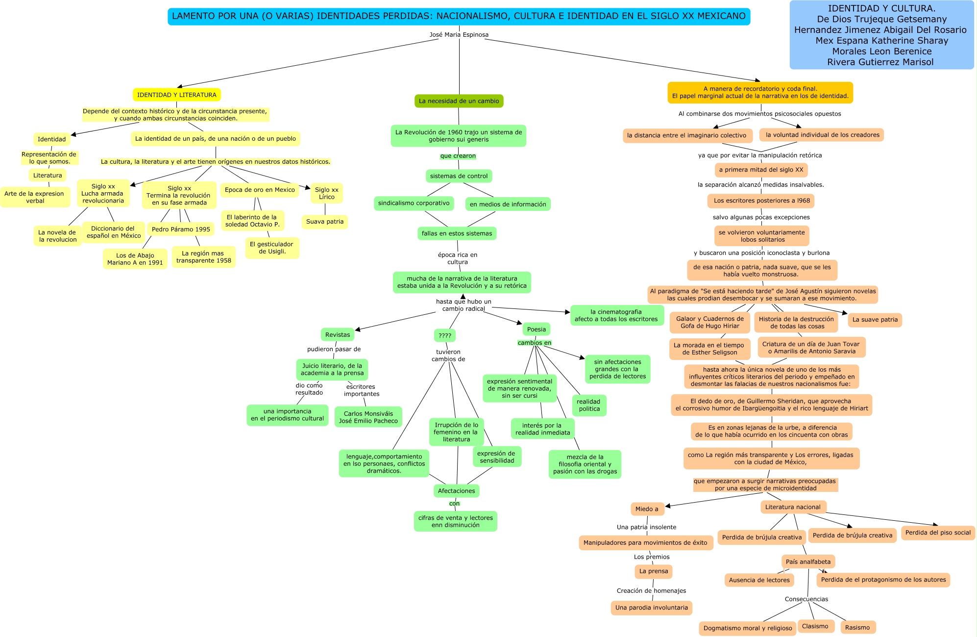 Este Cmap, tiene información relacionada con: LAMENTO POR UNA (O VARIAS) IDENTIDADES PERDIDAS, País analfabeta Consecuencias Clasismo, País analfabeta Consecuencias Rasismo, Poesia cambios en interés por la realidad inmediata, Identidad Representación de lo que somos. Literatura, mucha de la narrativa de la literatura estaba unida a la Revolución y a su retórica hasta que hubo un cambio radical Revistas, Poesia cambios en mezcla de la filosofia oriental y pasión con las drogas, Afectaciones con cifras de venta y lectores enn disminución, País analfabeta Perdida de el protagonismo de los autores, de esa nación o patria, nada suave, que se les había vuelto monstruosa. Al paradigma de "Se está haciendo tarde" de José Agustín siguieron novelas las cuales prodian desembocar y se sumaran a ese movimiento. Criatura de un día de Juan Tovar o Amarilis de Antonio Saravia, sindicalismo corporativo ???? fallas en estos sistemas, se volvieron voluntariamente lobos solitarios y buscaron una posición iconoclasta y burlona de esa nación o patria, nada suave, que se les había vuelto monstruosa., sistemas de control ???? en medios de información, ???? tuvieron cambios de lenguaje,comportamiento en lso personaes, conflictos dramáticos., IDENTIDAD Y LITERATURA Depende del contexto histórico y de la circunstancia presente, y cuando ambas circunstancias coinciden. Identidad, sistemas de control ???? sindicalismo corporativo, Criatura de un día de Juan Tovar o Amarilis de Antonio Saravia hasta ahora la única novela de uno de los más influyentes críticos literarios del periodo y empeñado en desmontar las falacias de nuestros nacionalismos fue: El dedo de oro, de Guillermo Sheridan, que aprovecha el corrosivo humor de Ibargüengoitia y el rico lenguaje de Hiriart, en medios de información ???? fallas en estos sistemas, El dedo de oro, de Guillermo Sheridan, que aprovecha el corrosivo humor de Ibargüengoitia y el rico lenguaje de Hiriart Es en zonas lejanas de la urbe, a diferencia de lo que había ocurrido en los cincuenta con obras como La región más transparente y Los errores, ligadas con la ciudad de México,, La morada en el tiempo de Esther Seligson hasta ahora la única novela de uno de los más influyentes críticos literarios del periodo y empeñado en desmontar las falacias de nuestros nacionalismos fue: El dedo de oro, de Guillermo Sheridan, que aprovecha el corrosivo humor de Ibargüengoitia y el rico lenguaje de Hiriart, Literatura nacional ???? País analfabeta