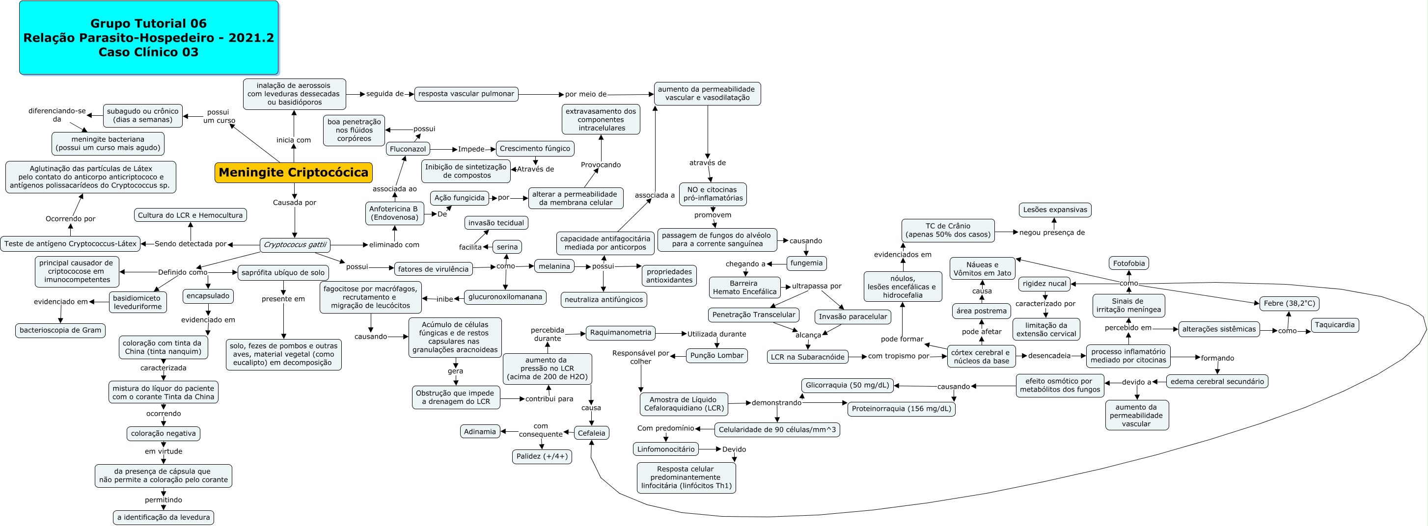 Esse mapa conceitual, produzido no IHMC CmapTools, tem a informação relacionada a: Meningite Criptocócica, Meningite Criptocócica possui um curso subagudo ou crônico (dias a semanas), Celularidade de 90 células/mm^3 Com predomínio Linfomonocitário, Amostra de Líquido Cefaloraquidiano (LCR) demonstrando Proteinorraquia (156 mg/dL), melanina possui propriedades antioxidantes, Fluconazol Impede Crescimento fúngico, Linfomonocitário Devido Resposta celular predominantemente linfocitária (linfócitos Th1), edema cerebral secundário devido a efeito osmótico por metabólitos dos fungos, Invasão paracelular alcança LCR na Subaracnóide, efeito osmótico por metabólitos dos fungos causando Proteinorraquia (156 mg/dL), Fluconazol possui boa penetração nos flúidos corpóreos, coloração com tinta da China (tinta nanquim) caracterizada mistura do líquor do paciente com o corante Tinta da China, glucuronoxilomanana inibe fagocitose por macrófagos, recrutamento e migração de leucócitos, Sinais de irritação meníngea como Náueas e Vômitos em Jato, córtex cerebral e núcleos da base pode formar nóulos, lesões encefálicas e hidrocefalia, Amostra de Líquido Cefaloraquidiano (LCR) demonstrando Glicorraquia (50 mg/dL), Cryptococus gattii possui fatores de virulência, passagem de fungos do alvéolo para a corrente sanguínea causando fungemia, Sinais de irritação meníngea como Febre (38,2°C), Cryptococus gattii Definido como principal causador de criptococose em imunocompetentes, nóulos, lesões encefálicas e hidrocefalia evidenciados em TC de Crânio (apenas 50% dos casos)