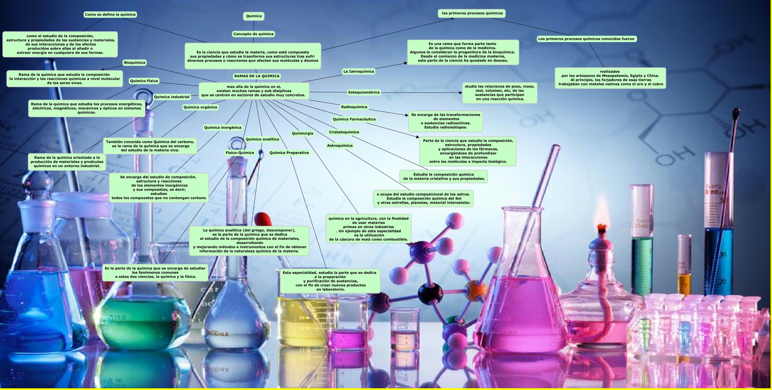 Este Cmap, tiene información relacionada con: tomas chonay, mas alla de la quimica en si, existen muchas ramas y sub-disiplinas que se centran en sectores de estudio muy concretos. Química analítica La química analítica (del griego, descomponer), es la parte de la química que se dedica al estudio de la composición química de materiales, desarrollando y mejorando métodos e instrumentos con el fin de obtener información de la naturaleza química de la materia., mas alla de la quimica en si, existen muchas ramas y sub-disiplinas que se centran en sectores de estudio muy concretos. Química orgánica También conocida como Química del carbono, es la rama de la química que se encarga del estudio de la materia viva., mas alla de la quimica en si, existen muchas ramas y sub-disiplinas que se centran en sectores de estudio muy concretos. Bioquímica Rama de la quimica que estudia la composición la interacción y las reacciones químicas a nivel molecular de los seres vivos., Es la ciencia que estudia la materia, como está compuesta sus propiedades y cómo se trasnforma sus estructuras tras sufri diversos procesos o reacciones que afectan sus moléculas y átomos ???? los primeros procesos quimicos, mas alla de la quimica en si, existen muchas ramas y sub-disiplinas que se centran en sectores de estudio muy concretos. Quimiurgia química en la agricultura, con la finalidad de usar materias primas en otras industrias . Un ejemplo de esta especialidad es la utilización de la cáscara de maíz como combustible., mas alla de la quimica en si, existen muchas ramas y sub-disiplinas que se centran en sectores de estudio muy concretos. Química inorgánica Se encarga del estudio de composición, estructura y reacciones de los elementos inorgánicos y sus compuestos, es decir, estudian todos los compuestos que no contengan carbono, mas alla de la quimica en si, existen muchas ramas y sub-disiplinas que se centran en sectores de estudio muy concretos. Química Preparativa Esta especialidad, estudia la parte que se dedica a la preparación y purificación de sustancias, con el fin de crear nuevos productos en laboratorio., mas alla de la quimica en si, existen muchas ramas y sub-disiplinas que se centran en sectores de estudio muy concretos. Química industrial Rama de la química orientada a la producción de materiales y prodcutos químicos en un entorno industrial., Es la ciencia que estudia la materia, como está compuesta sus propiedades y cómo se trasnforma sus estructuras tras sufri diversos procesos o reacciones que afectan sus moléculas y átomos RAMAS DE LA QUIMICA mas alla de la quimica en si, existen muchas ramas y sub-disiplinas que se centran en sectores de estudio muy concretos., mas alla de la quimica en si, existen muchas ramas y sub-disiplinas que se centran en sectores de estudio muy concretos. Radioquímica Se encarga de las transformaciones de elementos o sustancias radioactivas. Estudia radioisótopos., los primeros procesos quimicos Los primeros procesos químicos conocidos fueron realizados por los artesanos de Mesopotamia, Egipto y China. Al principio, los forjadores de esas tierras trabajaban con metales nativos como el oro y el cobre, Es la ciencia que estudia la materia, como está compuesta sus propiedades y cómo se trasnforma sus estructuras tras sufri diversos procesos o reacciones que afectan sus moléculas y átomos Como se define la química como el estudio de la composición, estructura y propiedades de las sustancias y materiales, de sus interacciones y de los efectos producidos sobre ellas al añadir o extraer energía en cualquiera de sus formas., mas alla de la quimica en si, existen muchas ramas y sub-disiplinas que se centran en sectores de estudio muy concretos. Estequiométrica studia las relaciones de peso, masa, mol, volumen, etc, de las sustancias que participan en una reacción química., mas alla de la quimica en si, existen muchas ramas y sub-disiplinas que se centran en sectores de estudio muy concretos. Físico-Química Es la parte de la química que se encarga de estudiar los fenómenos comunes a estas dos ciencias, la química y la física., Quimica Concepto de química Es la ciencia que estudia la materia, como está compuesta sus propiedades y cómo se trasnforma sus estructuras tras sufri diversos procesos o reacciones que afectan sus moléculas y átomos, mas alla de la quimica en si, existen muchas ramas y sub-disiplinas que se centran en sectores de estudio muy concretos. La Iatroquímica Es una rama que forma parte tanto de la química como de la medicina. Algunos la consideran la progenitora de la bioquímica. Desde el comienzo de la medicina moderna, esta parte de la ciencia ha quedado en desuso., mas alla de la quimica en si, existen muchas ramas y sub-disiplinas que se centran en sectores de estudio muy concretos. Cristaloquímica Estudia la composición química de la materia cristalina y sus propiedades., mas alla de la quimica en si, existen muchas ramas y sub-disiplinas que se centran en sectores de estudio muy concretos. Químico Física Rama de la quimica que estudia los procesos energéticos, eléctricos, magnéticos, mecanicos y ópticos en sistemas quimicos., mas alla de la quimica en si, existen muchas ramas y sub-disiplinas que se centran en sectores de estudio muy concretos. Astroquímica e ocupa del estudio composicional de los astros. Estudia la composición química del Sol y otras estrellas, planetas, material interestelar., mas alla de la quimica en si, existen muchas ramas y sub-disiplinas que se centran en sectores de estudio muy concretos. Química Farmacéutica Parte de la ciencia que estudia la composición, estructura, propiedades y aplicaciones de los fármacos, encargándose de profundizar en las interacciones entre las moléculas e impacto biológico.