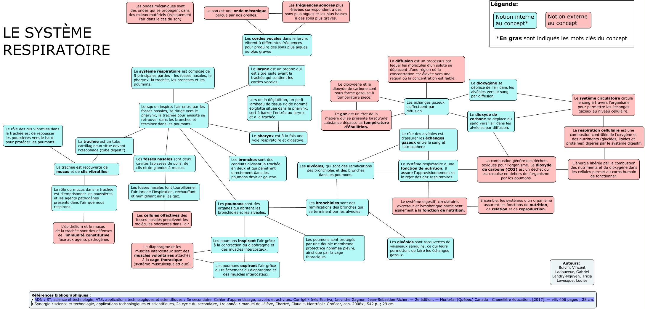 Cette carte de concepts créée avec IHMC CmapTools traite de: Équipe 6 Travail 1, Les poumons sont des organes qui abritent les bronchioles et les alvéoles. ???? Les bronchioles sont des ramifications des bronches qui se terminent par les alvéoles., Le son est une onde mécanique perçue par nos oreilles. ???? Les fréquences sonores plus élevées correspondent à des sons plus aïgues et les plus basses à des sons plus graves., La trachée est un tube cartillagineux situé devant l'œsophage (tube digestif). ???? La trachée est recouverte de mucus et de cils vibratiles., Le rôle du mucus dans la trachée est d'emprisonner les poussières et les agents pathogènes présents dans l’air que nous respirons. ???? L'épithélium et le mucus de la trachée sont des défenses de l'immunité constitutive face aux agents pathogènes, Le larynx est un organe qui est situé juste avant la trachée qui contient les cordes vocales. ???? Lors de la déglutition, un petit lambeau de tissus rigide nommé épiglotte située dans le pharynx, sert à barrer l’entrée au larynx et à la trachée., Les bronchioles sont des ramifications des bronches qui se terminent par les alvéoles. ???? Les alvéoles sont recouvertes de vaisseaux sanguins, ce qui leurs permettent de faire les échanges gazeux., Les poumons sont des organes qui abritent les bronchioles et les alvéoles. ???? Les poumons sont protégés par une double membrane protectrice nommée plèvre, ainsi que par la cage thoracique., Les fosses nasales font tourbillonner l’air lors de l’inspiration, réchauffant et humidifiant ainsi les gaz. ???? Les cellules olfactives des fosses nasales percoivent les molécules odorantes dans l'air, Les poumons sont des organes qui abritent les bronchioles et les alvéoles. ???? Les poumons inspirent l'air grâce à la contraction du diaphragme et des muscles intercostaux., Le pharynx est à la fois une voie respiratoire et digestive. ???? Lors de la déglutition, un petit lambeau de tissus rigide nommé épiglotte située dans le pharynx, sert à barrer l’entrée au larynx et à la trachée., L’énergie libérée par la combustion des nutriments et du dioxygène dans les cellules permet au corps humain de fonctionner. ???? La combustion génère des déchets toxiques pour l’organisme. Le dioxyde de carbone (CO2) est un déchet qui est expulsé en dehors de l’organisme par les poumons., Les alvéoles, qui sont des ramifications des bronchioles et des bronches dans les poumons. ???? Le système respiratoire a une fonction de nutrition. Il assure l'approvisionnement et le rejet des gaz respiratoires., Le système respiratoire est composé de 5 principales parties : les fosses nasales, le pharynx, la trachée, les bronches et les poumons. ???? Lorsqu’on inspire, l’air entre par les fosses nasales, se dirige vers le pharynx, la trachée pour ensuite se retrouver dans les bronches et terminer dans les poumons., Les échanges gazeux s'effectuent par diffusion. ???? Le gaz est un état de la matière qui se présente lorsqu'une substance dépasse sa température d'ébullition., Lorsqu’on inspire, l’air entre par les fosses nasales, se dirige vers le pharynx, la trachée pour ensuite se retrouver dans les bronches et terminer dans les poumons. ???? Les poumons sont des organes qui abritent les bronchioles et les alvéoles., Le dioxygène se déplace de l'air dans les alvéoles vers le sang par diffusion. ???? Le système circulatoire circule le sang à travers l'organisme pour permettre les échanges gazeux au niveau cellulaire., Les échanges gazeux s'effectuent par diffusion. . La diffusion est un processus par lequel les molécules d'un soluté se déplacent d’une région où la concentration est élevée vers une région où la concentration est faible., Le rôle des alvéoles est d'assurer les échanges gazeux entre le sang et l'atmosphère ???? Le système respiratoire a une fonction de nutrition. Il assure l'approvisionnement et le rejet des gaz respiratoires., Les poumons inspirent l'air grâce à la contraction du diaphragme et des muscles intercostaux. ???? Le diaphragme et les muscles intercostaux sont des muscles volontaires attachés à la cage thoracique (système musculosquelettique)., Les fosses nasales sont deux cavités tapissées de poils, de cils et de glandes à mucus. ???? Les fosses nasales font tourbillonner l’air lors de l’inspiration, réchauffant et humidifiant ainsi les gaz.