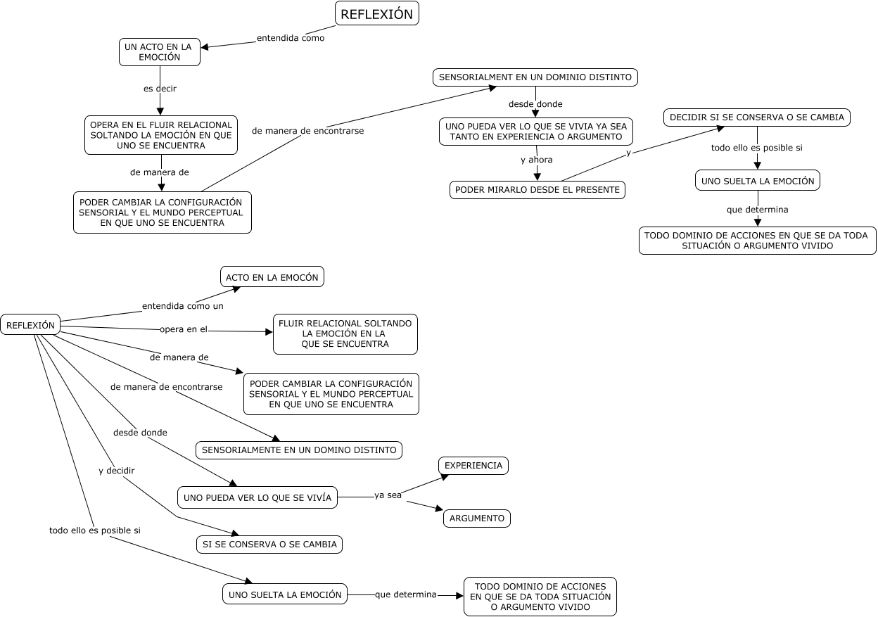 Este Cmap, tiene información relacionada con: Reflexión, REFLEXIÓN entendida como un ACTO EN LA EMOCÓN, REFLEXIÓN de manera de PODER CAMBIAR LA CONFIGURACIÓN SENSORIAL Y EL MUNDO PERCEPTUAL EN QUE UNO SE ENCUENTRA, UNO PUEDA VER LO QUE SE VIVIA YA SEA TANTO EN EXPERIENCIA O ARGUMENTO y ahora PODER MIRARLO DESDE EL PRESENTE, PODER MIRARLO DESDE EL PRESENTE y DECIDIR SI SE CONSERVA O SE CAMBIA, UNO PUEDA VER LO QUE SE VIVÍA ya sea EXPERIENCIA, REFLEXIÓN de manera de encontrarse SENSORIALMENTE EN UN DOMINO DISTINTO, DECIDIR SI SE CONSERVA O SE CAMBIA todo ello es posible si UNO SUELTA LA EMOCIÓN, REFLEXIÓN entendida como UN ACTO EN LA EMOCIÓN, UNO SUELTA LA EMOCIÓN que determina TODO DOMINIO DE ACCIONES EN QUE SE DA TODA SITUACIÓN O ARGUMENTO VIVIDO, REFLEXIÓN opera en el FLUIR RELACIONAL SOLTANDO LA EMOCIÓN EN LA QUE SE ENCUENTRA, SENSORIALMENT EN UN DOMINIO DISTINTO desde donde UNO PUEDA VER LO QUE SE VIVIA YA SEA TANTO EN EXPERIENCIA O ARGUMENTO, REFLEXIÓN todo ello es posible si UNO SUELTA LA EMOCIÓN, REFLEXIÓN y decidir SI SE CONSERVA O SE CAMBIA, PODER CAMBIAR LA CONFIGURACIÓN SENSORIAL Y EL MUNDO PERCEPTUAL EN QUE UNO SE ENCUENTRA de manera de encontrarse SENSORIALMENT EN UN DOMINIO DISTINTO, OPERA EN EL FLUIR RELACIONAL SOLTANDO LA EMOCIÓN EN QUE UNO SE ENCUENTRA de manera de PODER CAMBIAR LA CONFIGURACIÓN SENSORIAL Y EL MUNDO PERCEPTUAL EN QUE UNO SE ENCUENTRA, REFLEXIÓN desde donde UNO PUEDA VER LO QUE SE VIVÍA, UNO SUELTA LA EMOCIÓN que determina TODO DOMINIO DE ACCIONES EN QUE SE DA TODA SITUACIÓN O ARGUMENTO VIVIDO, UN ACTO EN LA EMOCIÓN es decir OPERA EN EL FLUIR RELACIONAL SOLTANDO LA EMOCIÓN EN QUE UNO SE ENCUENTRA, UNO PUEDA VER LO QUE SE VIVÍA ya sea ARGUMENTO