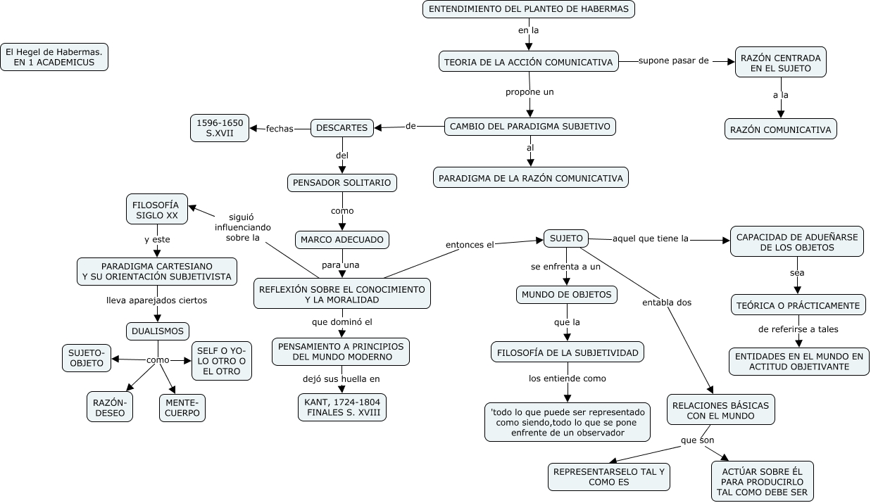Este Cmap, tiene información relacionada con: El Hegel de Habermas, ENTENDIMIENTO DEL PLANTEO DE HABERMAS en la TEORIA DE LA ACCIÓN COMUNICATIVA, REFLEXIÓN SOBRE EL CONOCIMIENTO Y LA MORALIDAD que dominó el PENSAMIENTO A PRINCIPIOS DEL MUNDO MODERNO, REFLEXIÓN SOBRE EL CONOCIMIENTO Y LA MORALIDAD entonces el SUJETO, REFLEXIÓN SOBRE EL CONOCIMIENTO Y LA MORALIDAD siguió influenciando sobre la FILOSOFÍA SIGLO XX, TEORIA DE LA ACCIÓN COMUNICATIVA supone pasar de RAZÓN CENTRADA EN EL SUJETO, CAMBIO DEL PARADIGMA SUBJETIVO al PARADIGMA DE LA RAZÓN COMUNICATIVA, TEORIA DE LA ACCIÓN COMUNICATIVA propone un CAMBIO DEL PARADIGMA SUBJETIVO, PENSAMIENTO A PRINCIPIOS DEL MUNDO MODERNO dejó sus huella en KANT, 1724-1804 FINALES S. XVIII, TEÓRICA O PRÁCTICAMENTE de referirse a tales ENTIDADES EN EL MUNDO EN ACTITUD OBJETIVANTE, FILOSOFÍA DE LA SUBJETIVIDAD los entiende como 'todo lo que puede ser representado como siendo,todo lo que se pone enfrente de un observador, FILOSOFÍA SIGLO XX y este PARADIGMA CARTESIANO Y SU ORIENTACIÓN SUBJETIVISTA, MUNDO DE OBJETOS que la FILOSOFÍA DE LA SUBJETIVIDAD, RELACIONES BÁSICAS CON EL MUNDO que son REPRESENTARSELO TAL Y COMO ES, SUJETO se enfrenta a un MUNDO DE OBJETOS, DESCARTES del PENSADOR SOLITARIO, PARADIGMA CARTESIANO Y SU ORIENTACIÓN SUBJETIVISTA lleva aparejados ciertos DUALISMOS, DESCARTES fechas 1596-1650 S.XVII, RELACIONES BÁSICAS CON EL MUNDO que son ACTÚAR SOBRE ÉL PARA PRODUCIRLO TAL COMO DEBE SER, CAPACIDAD DE ADUEÑARSE DE LOS OBJETOS sea TEÓRICA O PRÁCTICAMENTE, MARCO ADECUADO para una REFLEXIÓN SOBRE EL CONOCIMIENTO Y LA MORALIDAD