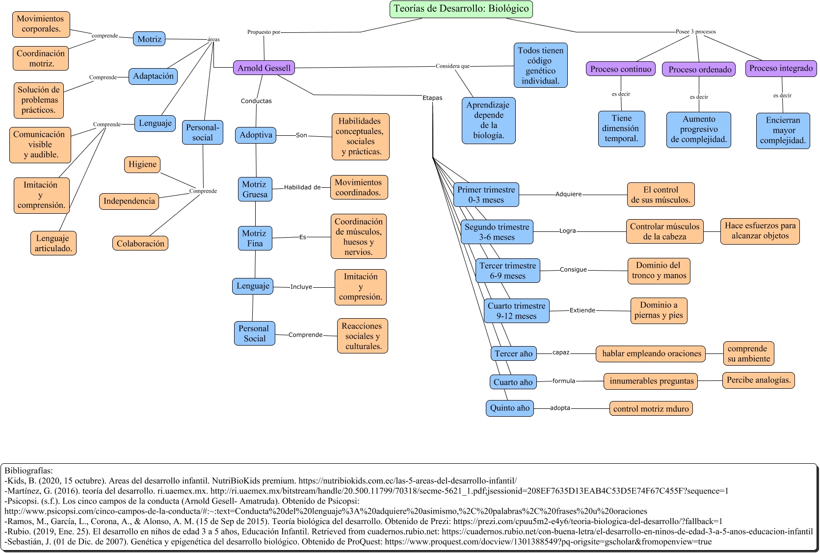 Este Cmap, tiene información relacionada con: Teorías del desarrollo biológico, Motriz comprende Coordinación motriz., Cuarto año formula innumerables preguntas, Teorías de Desarrollo: Biológico Posee 3 procesos Proceso ordenado, Arnold Gessell áreas Lenguaje, Arnold Gessell Etapas Quinto año, Arnold Gessell Etapas Primer trimestre 0-3 meses, Proceso ordenado es decir Aumento progresivo de complejidad., Arnold Gessell Etapas Tercer trimestre 6-9 meses, Tercer año capaz hablar empleando oraciones, Teorías de Desarrollo: Biológico Posee 3 procesos Proceso continuo, Arnold Gessell áreas Personal- social, Arnold Gessell Etapas Cuarto año, Lenguaje Comprende Lenguaje articulado., Motriz Gruesa ???? Motriz Fina, Tercer año capaz comprende su ambiente, Arnold Gessell Etapas Segundo trimestre 3-6 meses, Adaptación Comprende Solución de problemas prácticos., Motriz Gruesa Habilidad de Movimientos coordinados., Arnold Gessell Conductas Adoptiva, Arnold Gessell áreas Motriz
