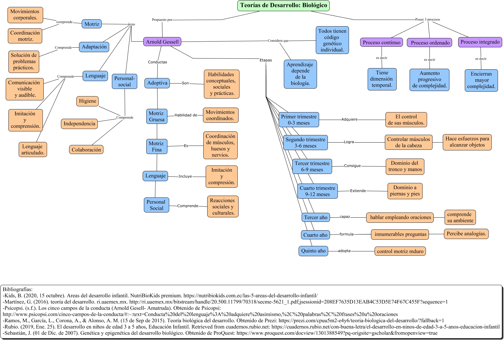 This Concept Map, created with IHMC CmapTools, has information related to: Teorías del desarrollo biológico 1, Segundo trimestre 3-6 meses Logra Controlar músculos de la cabeza, Arnold Gessell Considera que Todos tienen código genético individual., Cuarto año formula Percibe analogías., Arnold Gessell áreas Personal- social, Arnold Gessell áreas Adaptación, Motriz comprende Movimientos corporales., Teorías de Desarrollo: Biológico Propuesto por Arnold Gessell, Lenguaje Comprende Lenguaje articulado., Arnold Gessell Etapas Segundo trimestre 3-6 meses, Arnold Gessell áreas Motriz, Cuarto trimestre 9-12 meses Extiende Dominio a piernas y pies, Segundo trimestre 3-6 meses Logra Hace esfuerzos para alcanzar objetos, Arnold Gessell Etapas Tercer trimestre 6-9 meses, Arnold Gessell Considera que Aprendizaje depende de la biología., Tercer año capaz comprende su ambiente, Personal- social Comprende Higiene, Arnold Gessell áreas Lenguaje, Motriz Fina Es Coordinación de músculos, huesos y nervios., Proceso continuo es decir Tiene dimensión temporal., Primer trimestre 0-3 meses Adquiere El control de sus músculos.