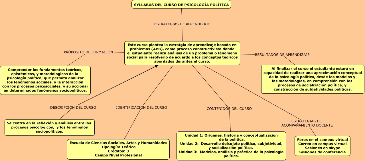 Este Cmap, tiene información relacionada con: MARY_PP_FASE 0, Este curso plantea la estratgia de aprendizaje basado en problemas (APB), como proceso constructivista donde el estudiante realiza análisis de un problema o fénomeno social para resolverlo de acuerdo a los conceptos teóricos abordados durantes el curso. RESULTADOS DE APRENDIZAJE Al finalizar el curso el estudiante estará en capacidad de realizar una aproximación conceptual de la psicología política, desde los modelos y las metodologías, en comprensión con los procesos de socialización política, y construcción de subjetividades políticas., Este curso plantea la estratgia de aprendizaje basado en problemas (APB), como proceso constructivista donde el estudiante realiza análisis de un problema o fénomeno social para resolverlo de acuerdo a los conceptos teóricos abordados durantes el curso. IDENTIFICACIÓN DEL CURSO Escuela de Ciencias Sociales, Artes y Humanidades Tipología: Teórico Créditos: 3 Campo Nivel Profesional, Este curso plantea la estratgia de aprendizaje basado en problemas (APB), como proceso constructivista donde el estudiante realiza análisis de un problema o fénomeno social para resolverlo de acuerdo a los conceptos teóricos abordados durantes el curso. PRÓPOSITO DE FORMACIÓN Comprender los fundamentos teóricos, epistémicos, y metodologicos de la psicología política, que permita analizar los fenómenos sociales, y la interacción con los procesos psicosociales, y su accionar en determinados fenómenos sociopoliticos., Este curso plantea la estratgia de aprendizaje basado en problemas (APB), como proceso constructivista donde el estudiante realiza análisis de un problema o fénomeno social para resolverlo de acuerdo a los conceptos teóricos abordados durantes el curso. DESCRIPCIÓN DEL CURSO Se centra en la reflexión y análisis entre los procesos psicológicos, y los fenómenos sociopoliticos., Este curso plantea la estratgia de aprendizaje basado en problemas (APB), como proceso constructivista donde el estudiante realiza análisis de un problema o fénomeno social para resolverlo de acuerdo a los conceptos teóricos abordados durantes el curso. CONTENIDOS DEL CURSO Unidad 1: Orígenes, historia y conceptualización de la política. Unidad 2: Desarrollo delsujeto político, subjetividad, y socialización política. Unidad 3: Modelos, análisis y práctica de la psicología política., SYLLABUS DEL CURSO DE PSICOLOGÍA POLÍTICA ESTRATEGIAS DE APRENDIZAJE Este curso plantea la estratgia de aprendizaje basado en problemas (APB), como proceso constructivista donde el estudiante realiza análisis de un problema o fénomeno social para resolverlo de acuerdo a los conceptos teóricos abordados durantes el curso., Este curso plantea la estratgia de aprendizaje basado en problemas (APB), como proceso constructivista donde el estudiante realiza análisis de un problema o fénomeno social para resolverlo de acuerdo a los conceptos teóricos abordados durantes el curso. ESTRATEGIAS DE ACOMPAÑAMIENTO DOCENTE Foros en el campus virtual Correo en campus virtual Sesiones en skype Sesiones de conferencia