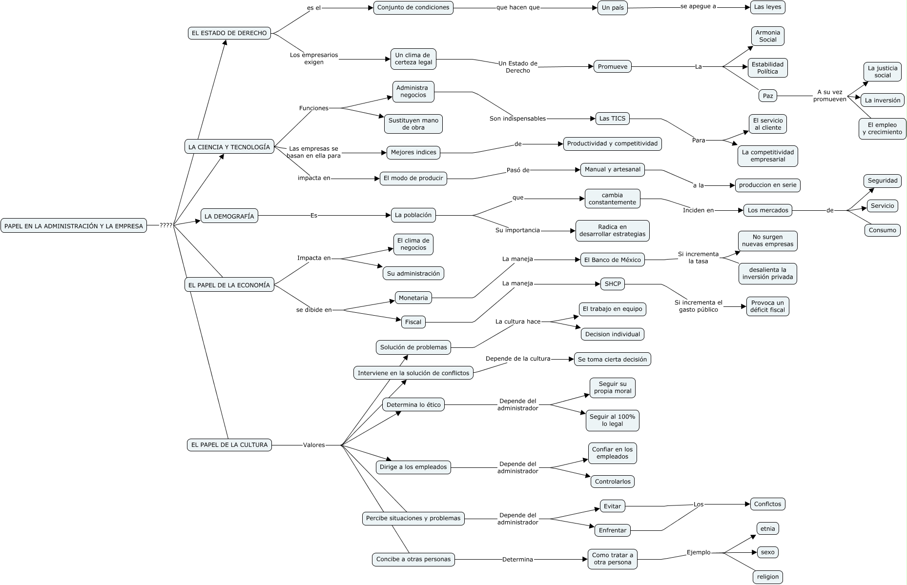 Este Cmap, tiene información relacionada con: EL PAPEL DE LA EMPRESA, Mejores indices de Productividad y competitividad, Interviene en la solución de conflictos Depende de la cultura Se toma cierta decisión, Como tratar a otra persona Ejemplo religion, Paz A su vez promueven La inversión, EL PAPEL DE LA CULTURA Valores Dirige a los empleados, El Banco de México Si incrementa la tasa desalienta la inversión privada, Las TICS Para La competitividad empresarial, Las TICS Para El servicio al cliente, EL PAPEL DE LA ECONOMÍA Impacta en El clima de negocios, cambia constantemente Inciden en Los mercados, Solución de problemas La cultura hace Decision individual, PAPEL EN LA ADMINISTRACIÓN Y LA EMPRESA ???? EL PAPEL DE LA CULTURA, PAPEL EN LA ADMINISTRACIÓN Y LA EMPRESA ???? EL PAPEL DE LA ECONOMÍA, LA CIENCIA Y TECNOLOGÍA impacta en El modo de producir, Los mercados de Seguridad, LA CIENCIA Y TECNOLOGÍA Las empresas se basan en ella para Mejores indices, Determina lo ético Depende del administrador Seguir al 100% lo legal, La población Su importancia Radica en desarrollar estrategias, Promueve La Armonia Social, LA CIENCIA Y TECNOLOGÍA Funciones Administra negocios