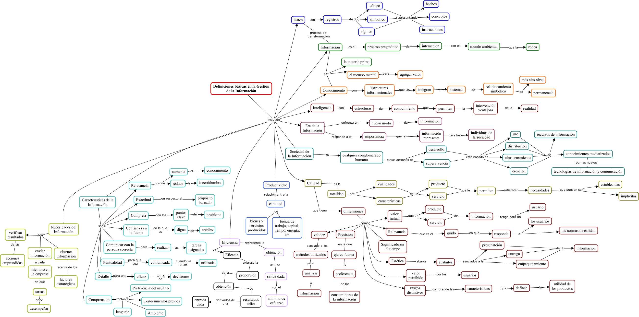 Este Cmap, tiene información relacionada con: Gestión de la Información, Definiciones básicas en la Gestión de la Información incluyen Sociedad de la Información, necesidades que pueden ser implícitas, características de un producto, intervención ventajosa de la realidad, producto que le permiten, Definiciones básicas en la Gestión de la Información incluyen Productividad, responde a las normas de calidad, definen la utilidad de los productos, obtener información acerca de los factores estratégicos, Relevancia porque reduce, analizar la información, valor actual que un producto, Exactitud con respecto al propósito buscado, conocimientos mediatizados por las nuevas tecnologías de información y comunicación, Relevancia porque aumenta, producto de información, información tenga para un usuario, rasgos distintivos comprende las características, obtención de una salida dada, cualquier conglomerado humano cuyas acciones de supervivencia