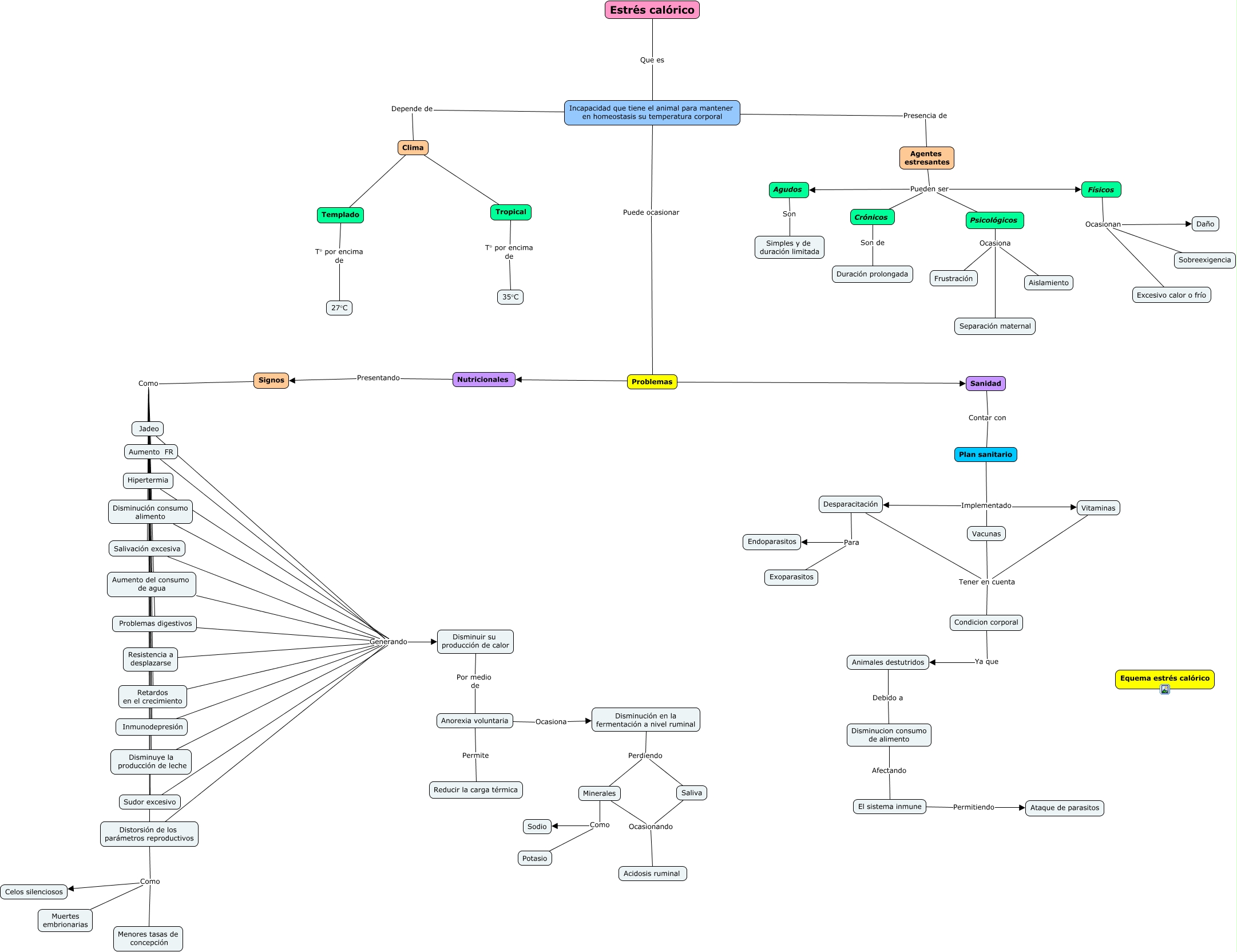 Este Cmap, tiene información relacionada con: Estrés calórico, Animales destutridos Debido a Disminucion consumo de alimento, Signos Como Aumento del consumo de agua, Retardos en el crecimiento Generando Disminuir su producción de calor, El sistema inmune Permitiendo Ataque de parasitos, Vacunas Tener en cuenta Condicion corporal, Disminución en la fermentación a nivel ruminal Perdiendo Saliva, Signos Como Resistencia a desplazarse, Incapacidad que tiene el animal para mantener en homeostasis su temperatura corporal Depende de Clima, Resistencia a desplazarse Generando Disminuir su producción de calor, Distorsión de los parámetros reproductivos Como Muertes embrionarias, Agentes estresantes Pueden ser Físicos, Disminuir su producción de calor Por medio de Anorexia voluntaria, Agentes estresantes Pueden ser Agudos, Aumento FR Generando Disminuir su producción de calor, Desparacitación Para Endoparasitos, Minerales Como Potasio, Templado T° por encima de 27°C, Plan sanitario Implementado Vacunas, Jadeo Generando Disminuir su producción de calor, Aumento del consumo de agua Generando Disminuir su producción de calor