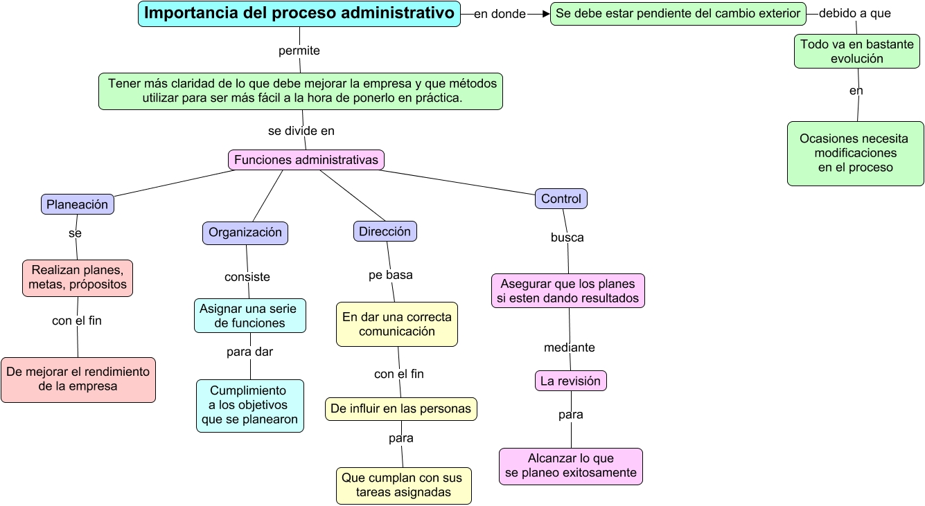 Este Cmap, tiene información relacionada con: mar, Funciones administrativas ???? Organización, Dirección pe basa En dar una correcta comunicación, En dar una correcta comunicación con el fin De influir en las personas, De influir en las personas para Que cumplan con sus tareas asignadas, Organización consiste Asignar una serie de funciones, Importancia del proceso administrativo permite Tener más claridad de lo que debe mejorar la empresa y que métodos utilizar para ser más fácil a la hora de ponerlo en práctica., Importancia del proceso administrativo en donde Se debe estar pendiente del cambio exterior, Funciones administrativas ???? Dirección, Funciones administrativas ???? Control, Realizan planes, metas, própositos con el fin De mejorar el rendimiento de la empresa, Funciones administrativas ???? Planeación, Asegurar que los planes si esten dando resultados mediante La revisión, Planeación se Realizan planes, metas, própositos, Todo va en bastante evolución debido a que Se debe estar pendiente del cambio exterior, La revisión para Alcanzar lo que se planeo exitosamente, Asignar una serie de funciones para dar Cumplimiento a los objetivos que se planearon, Todo va en bastante evolución en Ocasiones necesita modificaciones en el proceso, Control busca Asegurar que los planes si esten dando resultados, Tener más claridad de lo que debe mejorar la empresa y que métodos utilizar para ser más fácil a la hora de ponerlo en práctica. se divide en Funciones administrativas