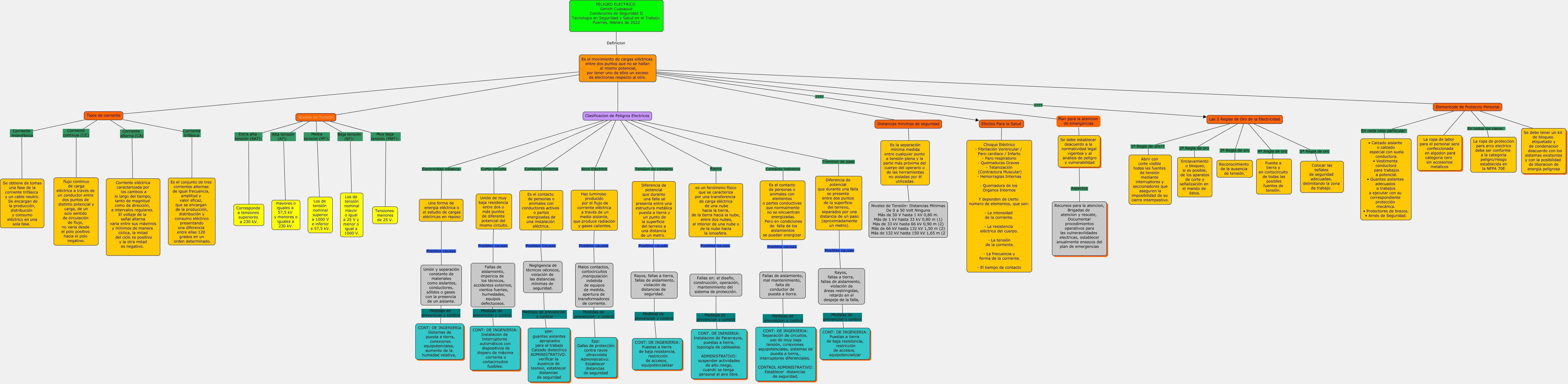 Este Cmap, tiene información relacionada con: PELIGRO ELECTRICO, Clasificacion de Peligros Electricos Rayos es un fenómeno físico que se caracteriza por una transferencia de carga eléctrica de una nube hacia la tierra, de la tierra hacia la nube, entre dos nubes, al interior de una nube o de la nube hacia la ionosfera., Las 5 Reglas de Oro de la Electricidad 3ª Regla de oro Reconocimiento de la ausencia de tensión., Fallas de aislamiento, impericia de los técnicos, accidentes externos, vientos fuertes, humedades, equipos defectuosos. Medidas de prevencion y control CONT: DE INGENIERIA: Instalacion de Interruptores automáticos con dispositivos de disparo de máxima corriente o cortacircuitos fusibles., Es el movimiento de cargas eléctricas entre dos puntos que no se hallan al mismo potencial, por tener uno de ellos un exceso de electrones respecto al otro. Plan para la atencion de emergencias Se debe establecer deacuerdo a la normatividad legal vigentea y al analisis de peligro y vulnerabilidad, Fallas en: el diseño, construcción, operación, mantenimiento del sistema de protección. Medidas de prevencion y control CONT. DE INENIERIA: Instalacion de Pararrayos, puestas a tierra, topología de cableados. ADMINISTRATIVO: suspender actividades de alto riesgo, cuando se tenga personal al aire libre., Es la separación mínima medida entre cualquier punto a tensión plena y la parte más próxima del cuerpo del operario o de las herramientas no aisladas por él utilizadas. ???? Niveles de Tensión- Distancias Mínimas De 0 a 50 Volt Ninguna Más de 50 V hasta 1 kV 0,80 m. Más de 1 kV hasta 33 kV 0,80 m (1) Más de 33 kV hasta 66 kV 0,90 m (2) Más de 66 kV hasta 132 kV 1,50 m (2) Más de 132 kV hasta 150 kV 1,65 m (2, Las 5 Reglas de Oro de la Electricidad 2ª Regla de oro Enclavamiento o bloqueo, si es posible, de los aparatos de corte y señalización en el mando de éstos., Negligencia de técnicos oécnicos, violación de las distancias mínimas de seguridad. Medidas de prevencion y control EPP: guantes aislantes apropiados para el trabajo Calzado dielectrico ADMINISTRATIVO: verificar la ausencia de tesnsio, establecer distancias de seguridad, Clasificacion de Peligros Electricos Tension de contacto Diferencia de potencial que durante una falla se presenta entre una estructura metálica puesta a tierra y un punto de la superficie del terreno a una distancia de un metro., Es el movimiento de cargas eléctricas entre dos puntos que no se hallan al mismo potencial, por tener uno de ellos un exceso de electrones respecto al otro. ???? Efectos Para la Salud, Las 5 Reglas de Oro de la Electricidad 4ª Regla de oro Puesta a tierra y en cortocircuito de todas las posibles fuentes de tensión., Las 5 Reglas de Oro de la Electricidad 5ª Regla de oro Colocar las señales de seguridad adecuadas, delimitando la zona de trabajo., Elementode de Proteccio Personal En todos los casos: La ropa de proteccion para arco electrico debe ser conforme a la categoria peligro/riesgo establecida en la NFPA 70E, Niveles de Tension Extra alta tensión (EAT): Corresponde a tensiones superiores a 230 kV., Clasificacion de Peligros Electricos Corto circuito Unión de muy baja resistencia entre dos o más puntos de diferente potencial del mismo circuito., Clasificacion de Peligros Electricos Contacto indirecto Es el contacto de personas o animales con elementos o partes conductivas que normalmente no se encuentran energizadas. Pero en condiciones de falla de los aislamientos se puedan energizar., Clasificacion de Peligros Electricos Tension de contacto Diferencia de potencial que durante una falla se presenta entre una estructura metálica puesta a tierra y un punto de la superficie del terreno a una distancia de un metro., Es el movimiento de cargas eléctricas entre dos puntos que no se hallan al mismo potencial, por tener uno de ellos un exceso de electrones respecto al otro. ???? Clasificacion de Peligros Electricos, Elementode de Proteccio Personal ???? Se debe tener un kit de bloqueo etiquetado y de condenacion deacuerdo con los sistemas existentes y con la posibilidad de liberacion de energia peligrosa, Rayos, fallas a tierra, fallas de aislamiento, violación de áreas restringidas, retardo en el despeje de la falla, Medidas de prevencion y control CONT: DE INGENIERIA: Puestas a tierra de baja resistencia, restricción de accesos, equipotencializar