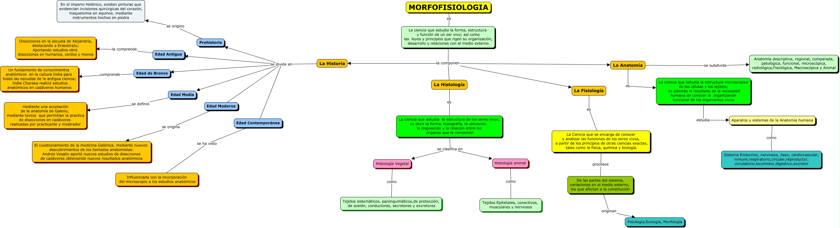 Este Cmap, tiene información relacionada con: Morfosiología, La ciencia que estudia la forma, estructura y función de un ser vivo; así como las leyes y principios que rigen su organización, desarrollo y relaciones con el medio externo. la componen La Fisiología, La Historia se divide en Edad Contemporánea, La ciencia que estudia la forma, estructura y función de un ser vivo; así como las leyes y principios que rigen su organización, desarrollo y relaciones con el medio externo. la componen La Historia, La Historia se divide en Edad Media, Histología animal como Tejidos Epiteliales, conectivos, musculares y nerviosos, Prehistoria se origino En el imperio Helénico, existen pinturas que evidencian incisiones quirúrgicas del corazón, traquetomia en equinos, mediante instrumentos hechos en piedra, La ciencia que estudia la forma, estructura y función de un ser vivo; así como las leyes y principios que rigen su organización, desarrollo y relaciones con el medio externo. la componen La Histología, La ciencia que estudia la estructura de los seres vivos, es decir la forma, topografía, la ubicación, la disposición y la relación entre los órganos que la componen se clasifica en Histología Vegetal, La Anatomía es La ciencia que estudia la estructura microscópica de las células y los tejidos; es además el resultado de la necesidad humana de conocer la organización funcional de los organismos vivos, Edad Moderna se origina El cuestionamiento de la medicina Galénica, mediante nuevos descubrimientos de los llamados anatomistas: Andres Vesalio aportó nuevos estudios de disecciones de cadáveres obteniendo nuevos resultados anatómicos, La Historia se divide en Edad de Bronce, La Historia se divide en Prehistoria, Edad Media se definió mediante una aceptación de la anatomía de Galeno, mediante textos que permitían la practica de disecciones en cadáveres realizadas por practicante y mostrador, La ciencia que estudia la estructura de los seres vivos, es decir la forma, topografía, la ubicación, la disposición y la relación entre los órganos que la componen se clasifica en Histología animal, La Fisiología es La Ciencia que se encarga de conocer y analizar las funciones de los seres vivos, a partir de los principios de otras ciencias exactas, tales como la física, química y biología., Edad de Bronce comprende Un fundamento de conocimientos anatómicos en la cultura India para todas las escuelas de la antigua ciencia; India Charaka realizó estudios anatómicos en cadáveres humanos, MORFOFISIOLOGIA es La ciencia que estudia la forma, estructura y función de un ser vivo; así como las leyes y principios que rigen su organización, desarrollo y relaciones con el medio externo., La Historia se divide en Edad Antigua, La ciencia que estudia la forma, estructura y función de un ser vivo; así como las leyes y principios que rigen su organización, desarrollo y relaciones con el medio externo. la componen La Anatomía, Histología Vegetal como Tejidos sistemáticos, parenquimáticos,de protección, de sostén, conductores, secretores y excretores