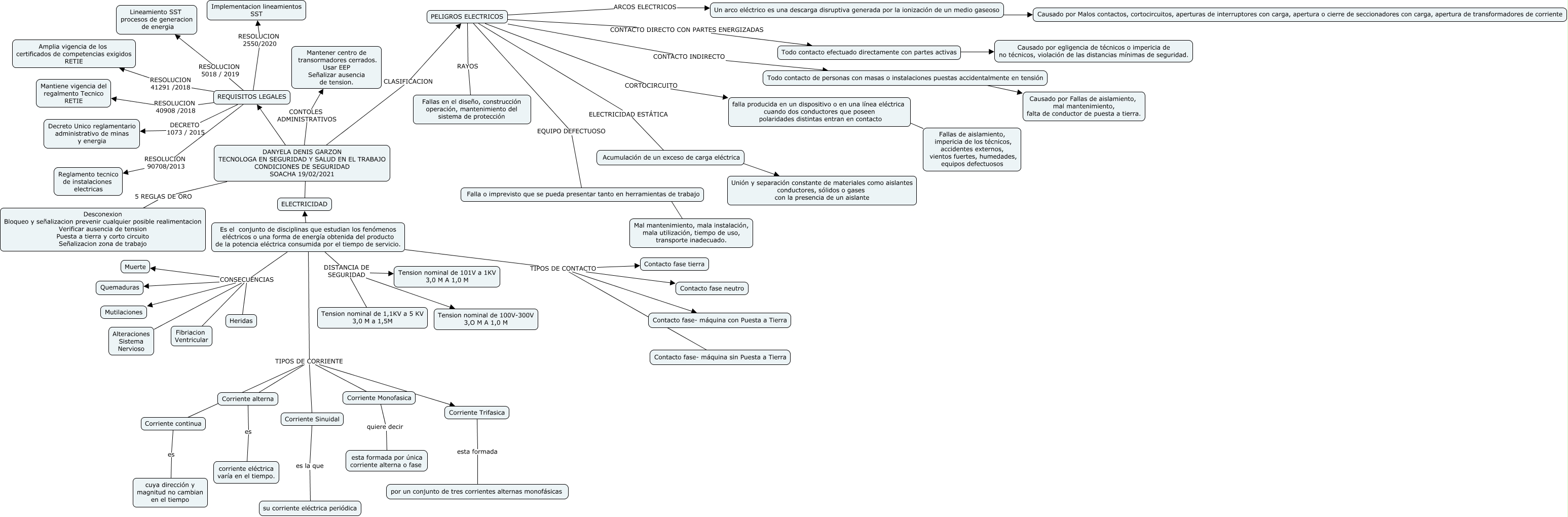 Este Cmap, tiene información relacionada con: RIESGO ELECTRICO, Corriente Sinuidal es la que su corriente eléctrica periódica, Es el conjunto de disciplinas que estudian los fenómenos eléctricos o una forma de energía obtenida del producto de la potencia eléctrica consumida por el tiempo de servicio. TIPOS DE CORRIENTE Corriente Sinuidal, Corriente Trifasica esta formada por un conjunto de tres corrientes alternas monofásicas, Todo contacto de personas con masas o instalaciones puestas accidentalmente en tensión ???? Causado por Fallas de aislamiento, mal mantenimiento, falta de conductor de puesta a tierra., DANYELA DENIS GARZON TECNOLOGA EN SEGURIDAD Y SALUD EN EL TRABAJO CONDICIONES DE SEGURIDAD SOACHA 19/02/2021 CONTOLES ADMINISTRATIVOS Mantener centro de transormadores cerrados. Usar EEP Señalizar ausencia de tension., Es el conjunto de disciplinas que estudian los fenómenos eléctricos o una forma de energía obtenida del producto de la potencia eléctrica consumida por el tiempo de servicio. CONSECUENCIAS Heridas, Es el conjunto de disciplinas que estudian los fenómenos eléctricos o una forma de energía obtenida del producto de la potencia eléctrica consumida por el tiempo de servicio. CONSECUENCIAS Muerte, PELIGROS ELECTRICOS CONTACTO INDIRECTO Todo contacto de personas con masas o instalaciones puestas accidentalmente en tensión, REQUISITOS LEGALES DECRETO 1073 / 2015 Decreto Unico reglamentario administrativo de minas y energia, Es el conjunto de disciplinas que estudian los fenómenos eléctricos o una forma de energía obtenida del producto de la potencia eléctrica consumida por el tiempo de servicio. CONSECUENCIAS Mutilaciones, REQUISITOS LEGALES RESOLUCION 41291 /2018 Amplia vigencia de los certificados de competencias exigidos RETIE, Acumulación de un exceso de carga eléctrica ???? Unión y separación constante de materiales como aislantes conductores, sólidos o gases con la presencia de un aislante, Es el conjunto de disciplinas que estudian los fenómenos eléctricos o una forma de energía obtenida del producto de la potencia eléctrica consumida por el tiempo de servicio. TIPOS DE CONTACTO Contacto fase- máquina sin Puesta a Tierra, Todo contacto efectuado directamente con partes activas ???? Causado por egligencia de técnicos o impericia de no técnicos, violación de las distancias mínimas de seguridad., Es el conjunto de disciplinas que estudian los fenómenos eléctricos o una forma de energía obtenida del producto de la potencia eléctrica consumida por el tiempo de servicio. TIPOS DE CONTACTO Contacto fase tierra, Un arco eléctrico es una descarga disruptiva generada por la ionización de un medio gaseoso ???? Causado por Malos contactos, cortocircuitos, aperturas de interruptores con carga, apertura o cierre de seccionadores con carga, apertura de transformadores de corriente, Es el conjunto de disciplinas que estudian los fenómenos eléctricos o una forma de energía obtenida del producto de la potencia eléctrica consumida por el tiempo de servicio. CONSECUENCIAS Quemaduras, PELIGROS ELECTRICOS RAYOS Fallas en el diseño, construcción operación, mantenimiento del sistema de protección, Corriente Monofasica quiere decir esta formada por única corriente alterna o fase, Es el conjunto de disciplinas que estudian los fenómenos eléctricos o una forma de energía obtenida del producto de la potencia eléctrica consumida por el tiempo de servicio. TIPOS DE CORRIENTE Corriente continua