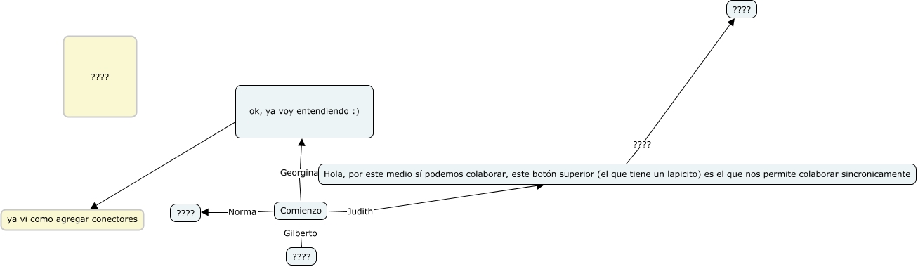 Este Cmap, tiene información relacionada con: Prueba, Hola, por este medio sí podemos colaborar, este botón superior (el que tiene un lapicito) es el que nos permite colaborar sincronicamente ???? ????, ok, ya voy entendiendo :) ???? ya vi como agregar conectores, Comienzo Georgina ok, ya voy entendiendo :), Comienzo Norma ????, Comienzo Gilberto ????, Comienzo Judith Hola, por este medio sí podemos colaborar, este botón superior (el que tiene un lapicito) es el que nos permite colaborar sincronicamente