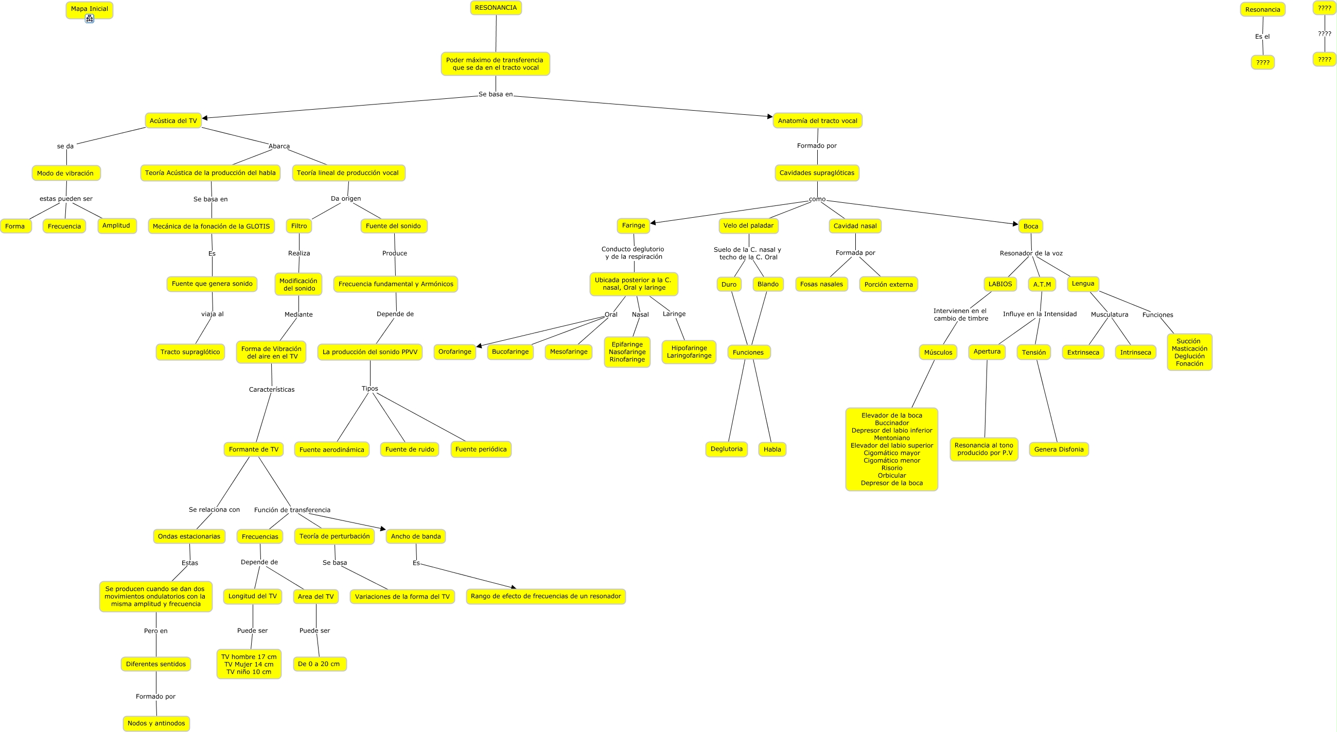 Este Cmap, tiene información relacionada con: Resonancia, Acústica del TV Abarca Teoría lineal de producción vocal, Filtro Realiza Modificación del sonido, Cavidades supraglóticas como Boca, Lengua Musculatura Extrinseca, Ancho de banda Es Rango de efecto de frecuencias de un resonador, La producción del sonido PPVV Tipos Fuente periódica, ???? ???? ????, Cavidades supraglóticas como Cavidad nasal, Frecuencias Depende de Longitud del TV, LABIOS Intervienen en el cambio de timbre Músculos, Fuente que genera sonido viaja al Tracto supraglótico, Formante de TV Función de transferencia Frecuencias, Faringe Conducto deglutorio y de la respiración Ubicada posterior a la C. nasal, Oral y laringe, Duro ???? Funciones, Se producen cuando se dan dos movimientos ondulatorios con la misma amplitud y frecuencia Pero en Diferentes sentidos, Anatomía del tracto vocal Formado por Cavidades supraglóticas, Boca Resonador de la voz A.T.M, Mecánica de la fonación de la GLOTIS Es Fuente que genera sonido, La producción del sonido PPVV Tipos Fuente aerodinámica, La producción del sonido PPVV Tipos Fuente de ruido