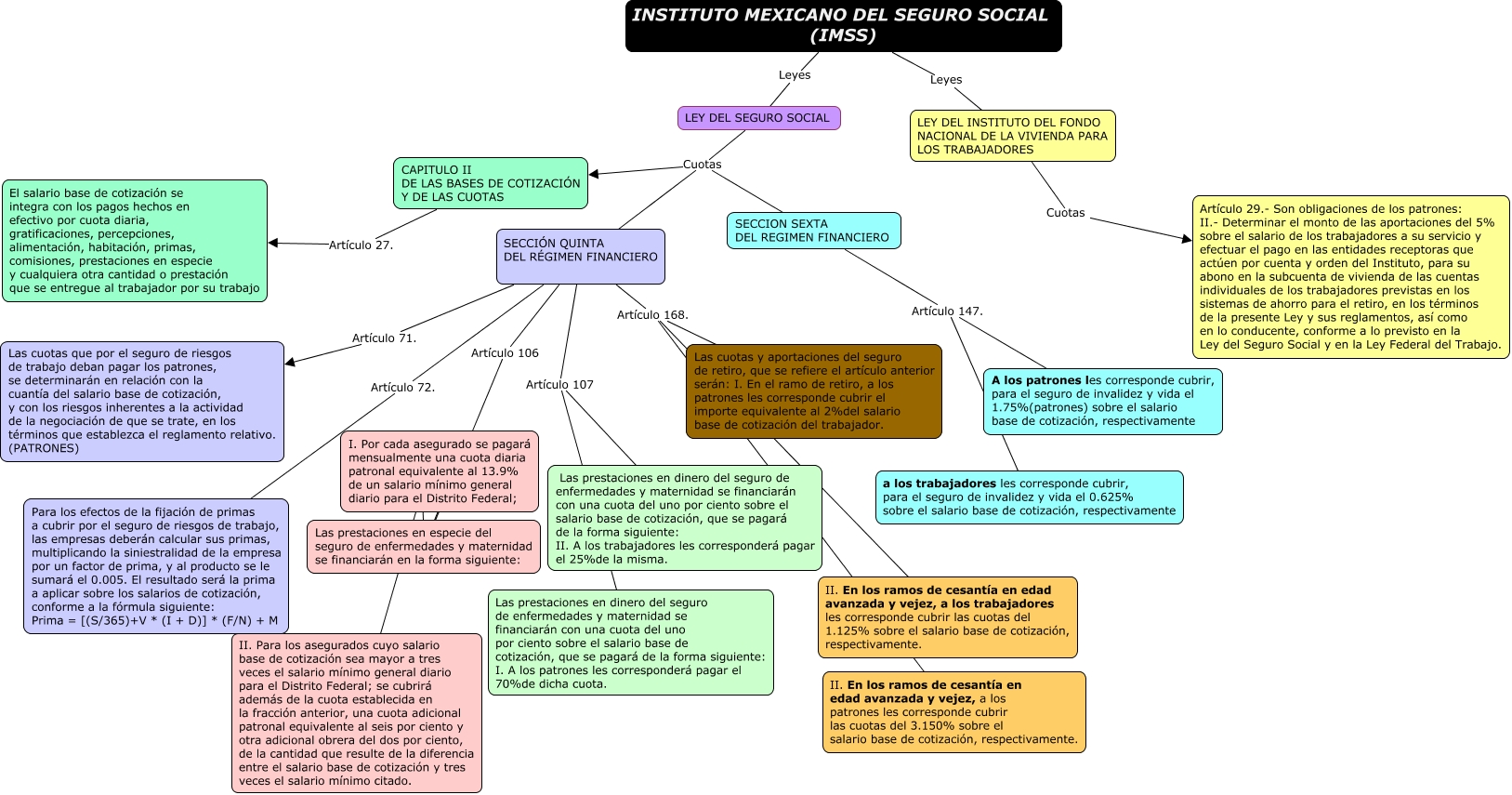 Este Cmap, tiene información relacionada con: IMSS, SECCIÓN QUINTA DEL RÉGIMEN FINANCIERO Artículo 168. II. En los ramos de cesantía en edad avanzada y vejez, a los trabajadores les corresponde cubrir las cuotas del 1.125% sobre el salario base de cotización, respectivamente., SECCIÓN QUINTA DEL RÉGIMEN FINANCIERO Artículo 71. Las cuotas que por el seguro de riesgos de trabajo deban pagar los patrones, se determinarán en relación con la cuantía del salario base de cotización, y con los riesgos inherentes a la actividad de la negociación de que se trate, en los términos que establezca el reglamento relativo. (PATRONES), SECCIÓN QUINTA DEL RÉGIMEN FINANCIERO Artículo 72. Para los efectos de la fijación de primas a cubrir por el seguro de riesgos de trabajo, las empresas deberán calcular sus primas, multiplicando la siniestralidad de la empresa por un factor de prima, y al producto se le sumará el 0.005. El resultado será la prima a aplicar sobre los salarios de cotización, conforme a la fórmula siguiente: Prima = [(S/365)+V * (I + D)] * (F/N) + M, SECCIÓN QUINTA DEL RÉGIMEN FINANCIERO Artículo 107 Las prestaciones en dinero del seguro de enfermedades y maternidad se financiarán con una cuota del uno por ciento sobre el salario base de cotización, que se pagará de la forma siguiente: I. A los patrones les corresponderá pagar el 70%de dicha cuota., SECCIÓN QUINTA DEL RÉGIMEN FINANCIERO Artículo 168. II. En los ramos de cesantía en edad avanzada y vejez, a los patrones les corresponde cubrir las cuotas del 3.150% sobre el salario base de cotización, respectivamente., SECCION SEXTA DEL REGIMEN FINANCIERO Artículo 147. a los trabajadores les corresponde cubrir, para el seguro de invalidez y vida el 0.625% sobre el salario base de cotización, respectivamente, SECCIÓN QUINTA DEL RÉGIMEN FINANCIERO Artículo 168. Las cuotas y aportaciones del seguro de retiro, que se refiere el artículo anterior serán: I. En el ramo de retiro, a los patrones les corresponde cubrir el importe equivalente al 2%del salario base de cotización del trabajador., LEY DEL INSTITUTO DEL FONDO NACIONAL DE LA VIVIENDA PARA LOS TRABAJADORES Cuotas Artículo 29.- Son obligaciones de los patrones: II.- Determinar el monto de las aportaciones del 5% sobre el salario de los trabajadores a su servicio y efectuar el pago en las entidades receptoras que actúen por cuenta y orden del Instituto, para su abono en la subcuenta de vivienda de las cuentas individuales de los trabajadores previstas en los sistemas de ahorro para el retiro, en los términos de la presente Ley y sus reglamentos, así como en lo conducente, conforme a lo previsto en la Ley del Seguro Social y en la Ley Federal del Trabajo., LEY DEL SEGURO SOCIAL Cuotas SECCION SEXTA DEL REGIMEN FINANCIERO, Las prestaciones en especie del seguro de enfermedades y maternidad se financiarán en la forma siguiente: ???? II. Para los asegurados cuyo salario base de cotización sea mayor a tres veces el salario mínimo general diario para el Distrito Federal; se cubrirá además de la cuota establecida en la fracción anterior, una cuota adicional patronal equivalente al seis por ciento y otra adicional obrera del dos por ciento, de la cantidad que resulte de la diferencia entre el salario base de cotización y tres veces el salario mínimo citado., Las prestaciones en especie del seguro de enfermedades y maternidad se financiarán en la forma siguiente: ???? I. Por cada asegurado se pagará mensualmente una cuota diaria patronal equivalente al 13.9% de un salario mínimo general diario para el Distrito Federal;, CAPITULO II DE LAS BASES DE COTIZACIÓN Y DE LAS CUOTAS Artículo 27. El salario base de cotización se integra con los pagos hechos en efectivo por cuota diaria, gratificaciones, percepciones, alimentación, habitación, primas, comisiones, prestaciones en especie y cualquiera otra cantidad o prestación que se entregue al trabajador por su trabajo, SECCIÓN QUINTA DEL RÉGIMEN FINANCIERO Artículo 107 Las prestaciones en dinero del seguro de enfermedades y maternidad se financiarán con una cuota del uno por ciento sobre el salario base de cotización, que se pagará de la forma siguiente: II. A los trabajadores les corresponderá pagar el 25%de la misma., SECCION SEXTA DEL REGIMEN FINANCIERO Artículo 147. A los patrones les corresponde cubrir, para el seguro de invalidez y vida el 1.75%(patrones) sobre el salario base de cotización, respectivamente, LEY DEL SEGURO SOCIAL Cuotas CAPITULO II DE LAS BASES DE COTIZACIÓN Y DE LAS CUOTAS, INSTITUTO MEXICANO DEL SEGURO SOCIAL (IMSS) Leyes LEY DEL SEGURO SOCIAL, INSTITUTO MEXICANO DEL SEGURO SOCIAL (IMSS) Leyes LEY DEL INSTITUTO DEL FONDO NACIONAL DE LA VIVIENDA PARA LOS TRABAJADORES, LEY DEL SEGURO SOCIAL Cuotas SECCIÓN QUINTA DEL RÉGIMEN FINANCIERO, SECCIÓN QUINTA DEL RÉGIMEN FINANCIERO Artículo 106 Las prestaciones en especie del seguro de enfermedades y maternidad se financiarán en la forma siguiente:
