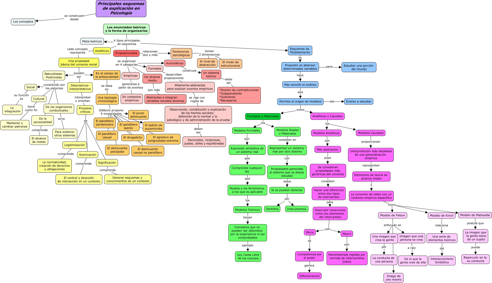 Este Cmap, tiene información relacionada con: Filosofía, Una propiedad básica del universo social pueden ser En el campo de la antisocialidad, Permite el origen de modelos como Analíticos y Causales, Cultural tiene como fin Mantener y cambiar patrones, Representar un sistema real por otro distinto con Propiedades parecidas al sistema que se desea estudiar, Comprende cualquier ley que Modela a los fenómenos a los que es aplicable, Descrubir conexiones entre los elementos del intercambio son Mirco, La conexión de estas con un contexto empírico específico como Modelo de Kinch, Una tipología criminológica Gibbons propone 9 modalidades El ladrón de automóviles, Principales esquemas de explicación en Psicología se construyen desde Los conceptos, La conexión de estas con un contexto empírico específico como Modelo de Felson, Formales y Materiales los Modelos Formales, Se consideran propiedades más genéricas del universo consisten Hacer una diferencia entre dos tipos de intercambio, Una imagen que crea la gente por La conducta de una persona, Modelos Teóricos tienen Conceptos que no pueden ser obtenidos por la experiencia ni ser comprobados, Social su función es La integración, Modelo de Felson enfocado en Una imagen que crea la gente, Legitimización comprende La normatividad, creación de derechos y obligaciones, De alcance medio son más Abstractas e integran variables sociales diversas, Proposicionales relacionan dos o más Fenómenos psicológicos, Elementos de teoría de alcance medio y La conexión de estas con un contexto empírico específico