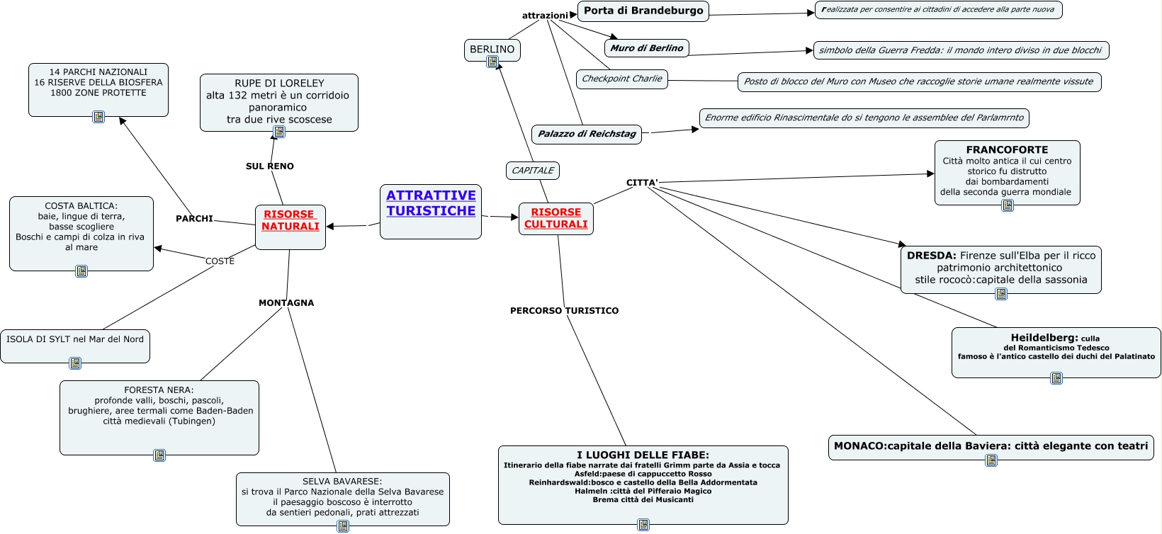Questa Cmap, creata con IHMC CmapTools, contiene informazioni relative a: germania, ATTRATTIVE TURISTICHE RISORSE NATURALI, RISORSE CULTURALI CITTA' MONACO:capitale della Baviera: città elegante con teatri, RISORSE NATURALI SUL RENO RUPE DI LORELEY alta 132 metri è un corridoio panoramico tra due rive scoscese, ATTRATTIVE TURISTICHE RISORSE CULTURALI, Porta di Brandeburgo ???? realizzata per consentire ai cittadini di accedere alla parte nuova, RISORSE NATURALI COSTE COSTA BALTICA: baie, lingue di terra, basse scogliere Boschi e campi di colza in riva al mare, RISORSE CULTURALI PERCORSO TURISTICO I LUOGHI DELLE FIABE: Itinerario della fiabe narrate dai fratelli Grimm parte da Assia e tocca Asfeld:paese di cappuccetto Rosso Reinhardswald:bosco e castello della Bella Addormentata Halmeln :città del Pifferaio Magico Brema città dei Musicanti, BERLINO attrazioni Muro di Berlino, RISORSE CULTURALI CITTA' Heildelberg: culla del Romanticismo Tedesco famoso è l'antico castello dei duchi del Palatinato, BERLINO attrazioni Checkpoint Charlie, Muro di Berlino simbolo della Guerra Fredda: il mondo intero diviso in due blocchi, RISORSE NATURALI MONTAGNA SELVA BAVARESE: si trova il Parco Nazionale della Selva Bavarese il paesaggio boscoso è interrotto da sentieri pedonali, prati attrezzati, Palazzo di Reichstag Enorme edificio Rinascimentale do si tengono le assemblee del Parlamrnto, RISORSE NATURALI MONTAGNA FORESTA NERA: profonde valli, boschi, pascoli, brughiere, aree termali come Baden-Baden città medievali (Tubingen), RISORSE CULTURALI CITTA' FRANCOFORTE Città molto antica il cui centro storico fu distrutto dai bombardamenti della seconda guerra mondiale, Checkpoint Charlie ???? Posto di blocco del Muro con Museo che raccoglie storie umane realmente vissute, RISORSE CULTURALI CITTA' DRESDA: Firenze sull'Elba per il ricco patrimonio architettonico stile rococò:capitale della sassonia, BERLINO attrazioni Palazzo di Reichstag, BERLINO attrazioni Porta di Brandeburgo, RISORSE NATURALI COSTE ISOLA DI SYLT nel Mar del Nord