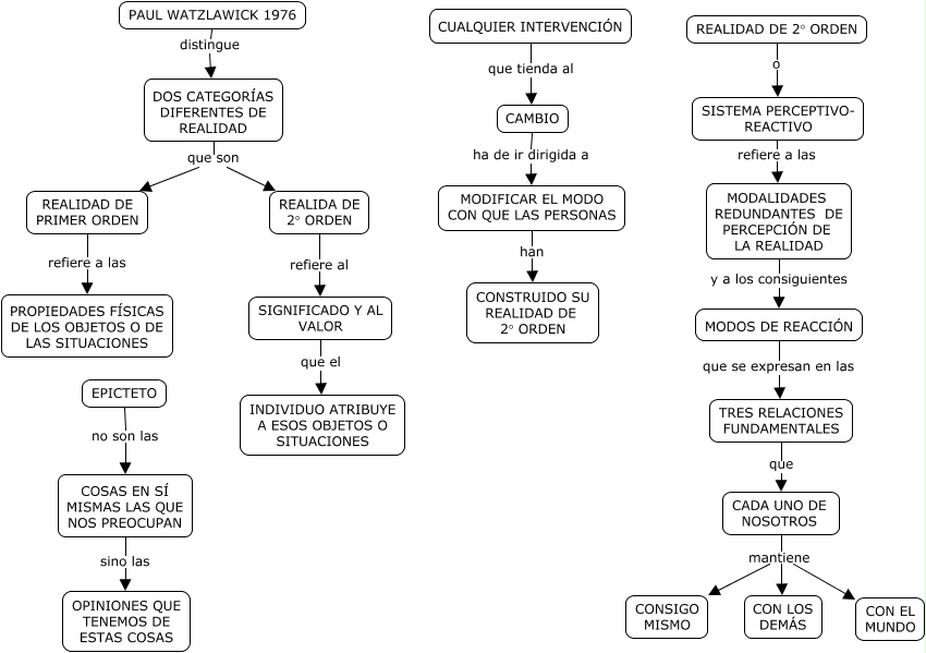 Este Cmap, tiene información relacionada con: REALIDADES DE 1° Y 2° ORDEN, CAMBIO ha de ir dirigida a MODIFICAR EL MODO CON QUE LAS PERSONAS, DOS CATEGORÍAS DIFERENTES DE REALIDAD que son REALIDA DE 2° ORDEN, TRES RELACIONES FUNDAMENTALES que CADA UNO DE NOSOTROS, CADA UNO DE NOSOTROS mantiene CONSIGO MISMO, MODOS DE REACCIÓN que se expresan en las TRES RELACIONES FUNDAMENTALES, CADA UNO DE NOSOTROS mantiene CON LOS DEMÁS, MODIFICAR EL MODO CON QUE LAS PERSONAS han CONSTRUIDO SU REALIDAD DE 2° ORDEN, REALIDAD DE 2° ORDEN o SISTEMA PERCEPTIVO- REACTIVO, SISTEMA PERCEPTIVO- REACTIVO refiere a las MODALIDADES REDUNDANTES DE PERCEPCIÓN DE LA REALIDAD, REALIDAD DE PRIMER ORDEN refiere a las PROPIEDADES FÍSICAS DE LOS OBJETOS O DE LAS SITUACIONES, MODALIDADES REDUNDANTES DE PERCEPCIÓN DE LA REALIDAD y a los consiguientes MODOS DE REACCIÓN, SIGNIFICADO Y AL VALOR que el INDIVIDUO ATRIBUYE A ESOS OBJETOS O SITUACIONES, DOS CATEGORÍAS DIFERENTES DE REALIDAD que son REALIDAD DE PRIMER ORDEN, CUALQUIER INTERVENCIÓN que tienda al CAMBIO, PAUL WATZLAWICK 1976 distingue DOS CATEGORÍAS DIFERENTES DE REALIDAD, EPICTETO no son las COSAS EN SÍ MISMAS LAS QUE NOS PREOCUPAN, REALIDA DE 2° ORDEN refiere al SIGNIFICADO Y AL VALOR, COSAS EN SÍ MISMAS LAS QUE NOS PREOCUPAN sino las OPINIONES QUE TENEMOS DE ESTAS COSAS, CADA UNO DE NOSOTROS mantiene CON EL MUNDO