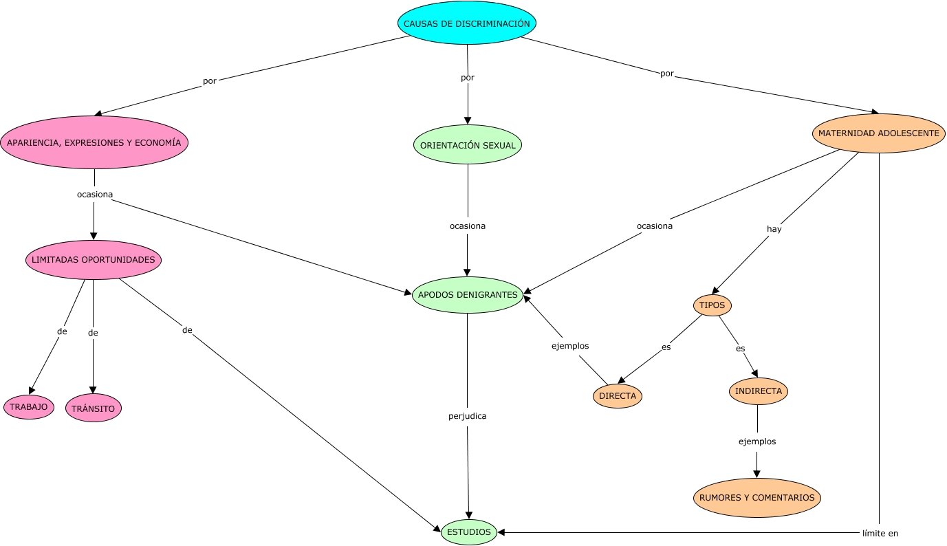Este Cmap, tiene información relacionada con: Sin Título 1, MATERNIDAD ADOLESCENTE hay TIPOS, INDIRECTA ejemplos RUMORES Y COMENTARIOS, CAUSAS DE DISCRIMINACIÓN por APARIENCIA, EXPRESIONES Y ECONOMÍA, TIPOS es DIRECTA, LIMITADAS OPORTUNIDADES de TRÁNSITO, APODOS DENIGRANTES perjudica ESTUDIOS, APARIENCIA, EXPRESIONES Y ECONOMÍA ocasiona LIMITADAS OPORTUNIDADES, TIPOS es INDIRECTA, LIMITADAS OPORTUNIDADES de TRABAJO, CAUSAS DE DISCRIMINACIÓN por ORIENTACIÓN SEXUAL, APARIENCIA, EXPRESIONES Y ECONOMÍA ocasiona APODOS DENIGRANTES, CAUSAS DE DISCRIMINACIÓN por MATERNIDAD ADOLESCENTE, MATERNIDAD ADOLESCENTE límite en ESTUDIOS, MATERNIDAD ADOLESCENTE ocasiona APODOS DENIGRANTES, DIRECTA ejemplos APODOS DENIGRANTES, ORIENTACIÓN SEXUAL ocasiona APODOS DENIGRANTES, LIMITADAS OPORTUNIDADES de ESTUDIOS