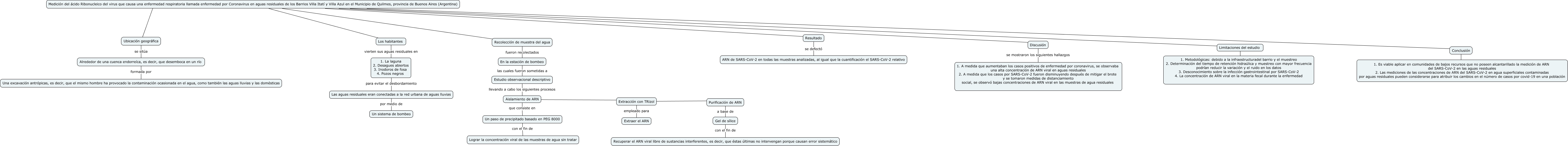 Este Cmap, tiene información relacionada con: Sin Título 2, Discusión se mostraron los siguientes hallazgos 1. A medida que aumentaban los casos positivos de enfermedad por coronavirus, se observaba una alta concentración de ARN viral en aguas residuales 2. A medida que los casos por SARS-CoV-2 fueron disminuyendo después de mitigar el brote y se tomaron medidas de distanciamiento social, se observó bajas concentraciones de ARN viral en las muestras de agua residuales, En la estación de bombeo las cuales fueron sometidas a Estudio observacional descriptivo, Medición del ácido Ribonucleico del virus que causa una enfermedad respiratoria llamada enfermedad por Coronavirus en aguas residuales de los Barrios Villa Itatí y Villa Azul en el Municipio de Quilmes, provincia de Buenos Aires (Argentina) . Resultado, Limitaciones del estudio se 1. Metodológicas: debido a la infraestructuradel barrio y el muestreo 2. Determinación del tiempo de retención hidraúlica y muestreo con mayor frecuencia podrían reducir la variación y el ruido en los datos 3. Desconocimiento sobre la infección gastrointestinal por SARS-CoV-2 4. La concentración de ARN viral en la materia fecal durante la enfermedad, Conclusión k 1. Es viable aplicar en comunidades de bajos recursos que no poseen alcantarillado la medición de ARN del SARS-CoV-2 en las aguas residuales 2. Las mediciones de las concentraciones de ARN del SARS-CoV-2 en agua superficiales contaminadas por aguas residuales pueden considerarse para atribuir los cambios en el número de casos por covid-19 en una población, Resultado se defectó ARN de SARS-CoV-2 en todas las muestras analizadas, al igual que la cuantificación el SARS-CoV-2 relativo, Un paso de precipitado basado en PEG 8000 con el fin de Lograr la concentración viral de las muestras de agua sin tratar, Medición del ácido Ribonucleico del virus que causa una enfermedad respiratoria llamada enfermedad por Coronavirus en aguas residuales de los Barrios Villa Itatí y Villa Azul en el Municipio de Quilmes, provincia de Buenos Aires (Argentina) mm Conclusión, Gel de sílice con el fin de Recuperar el ARN viral libre de sustancias interferentes, es decir, que éstas últimas no intervengan porque causan error sistemático, Las aguas residuales eran conectadas a la red urbana de aguas lluvias por medio de Un sistema de bombeo, Medición del ácido Ribonucleico del virus que causa una enfermedad respiratoria llamada enfermedad por Coronavirus en aguas residuales de los Barrios Villa Itatí y Villa Azul en el Municipio de Quilmes, provincia de Buenos Aires (Argentina) c Recolección de muestra del agua, Medición del ácido Ribonucleico del virus que causa una enfermedad respiratoria llamada enfermedad por Coronavirus en aguas residuales de los Barrios Villa Itatí y Villa Azul en el Municipio de Quilmes, provincia de Buenos Aires (Argentina) ???? Limitaciones del estudio, Los habitantes vierten sus aguas residuales en 1. La laguna 2. Desagues abiertos 3. Inodoros de fosa 4. Pozos negros, Extracción con TRizol m Purificación de ARN, Aislamiento de ARN x Extracción con TRizol, Aislamiento de ARN que consiste en Un paso de precipitado basado en PEG 8000, Extracción con TRizol empleado para Extraer el ARN, Recolección de muestra del agua fueron recolectados En la estación de bombeo, 1. La laguna 2. Desagues abiertos 3. Inodoros de fosa 4. Pozos negros para evitar el desbordamiento Las aguas residuales eran conectadas a la red urbana de aguas lluvias, Medición del ácido Ribonucleico del virus que causa una enfermedad respiratoria llamada enfermedad por Coronavirus en aguas residuales de los Barrios Villa Itatí y Villa Azul en el Municipio de Quilmes, provincia de Buenos Aires (Argentina) jjj Discusión