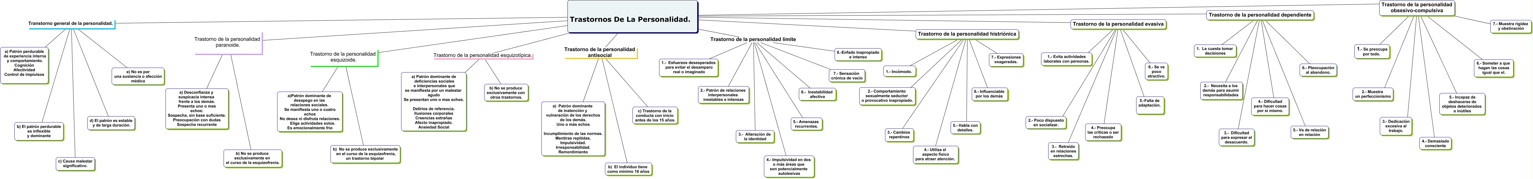 Este Cmap, tiene información relacionada con: Grupo11, Trastornos De La Personalidad. Trastorno de la personalidad esquizoide. b) No se produce exclusivamente en el curso de la esquizofrenia, un trastorno bipolar, Trastorno de la personalidad histriónica ???? 4.- Utiliza el aspecto físico para atraer atención., Trastorno de la personalidad histriónica ???? 2.- Comportamiento sexualmente seductor o provocativo inapropiado., Trastornos De La Personalidad. Trastorno de la personalidad esquizoide. a)Patrón dominante de desapego en las relaciones sociales. Se manifiesta uno o cuatro echos No desea ni disfruta relaciones. Elige actividades solos. Es emocionalmente frío, Trastorno de la personalidad histriónica ???? 5.- Habla con detalles., Trastornos De La Personalidad. Trastorno de la personalidad límite 2.- Patrón de relaciones interpersonales inestables e intensas, Trastornos De La Personalidad. Trastorno de la personalidad antisocial a) Patrón dominante de inatención y vulneración de los derechos de los demás. Uno o más echos Incumplimiento de las normas. Mentiras repitidas. Impulsividad. Irresponsabilidad. Remordimiento, Trastorno de la personalidad dependiente ???? 3.- Dificultad para expresar el desacuerdo., Trastornos De La Personalidad. Trastorno de la personalidad paranoide. a) Desconfianza y suspicacia intensa frente a los demás. Presenta uno o mas echos: Sospecha, sin base suficiente. Preocupación con dudas Sospecha recurrente, Trastorno de la personalidad evasiva ???? 2.- Poco dispuesto en socializar., Trastorno de la personalidad obsesivo-compulsiva ???? 4.- Demasiado consciente, Trastorno de la personalidad evasiva ???? 1.- Evita actividades laborales con personas., Trastornos De La Personalidad. Transtorno general de la personalidad. b) El patrón perdurable es inflexible y dominante, Trastornos De La Personalidad. Trastorno de la personalidad límite 3.- Alteración de la identidad, Trastornos De La Personalidad. Transtorno general de la personalidad. d) El patrón es estable y de larga duración., Trastornos De La Personalidad. ???? Trastorno de la personalidad histriónica, Trastorno de la personalidad evasiva ???? 6.- Se ve poco atractivo., Trastornos De La Personalidad. Trastorno de la personalidad antisocial c) Trastorno de la conducta con inicio antes de los 15 años., Trastorno de la personalidad obsesivo-compulsiva ???? 1.- Se preocupa por todo., Trastornos De La Personalidad. Trastorno de la personalidad antisocial b) El individuo tiene como mínimo 18 años