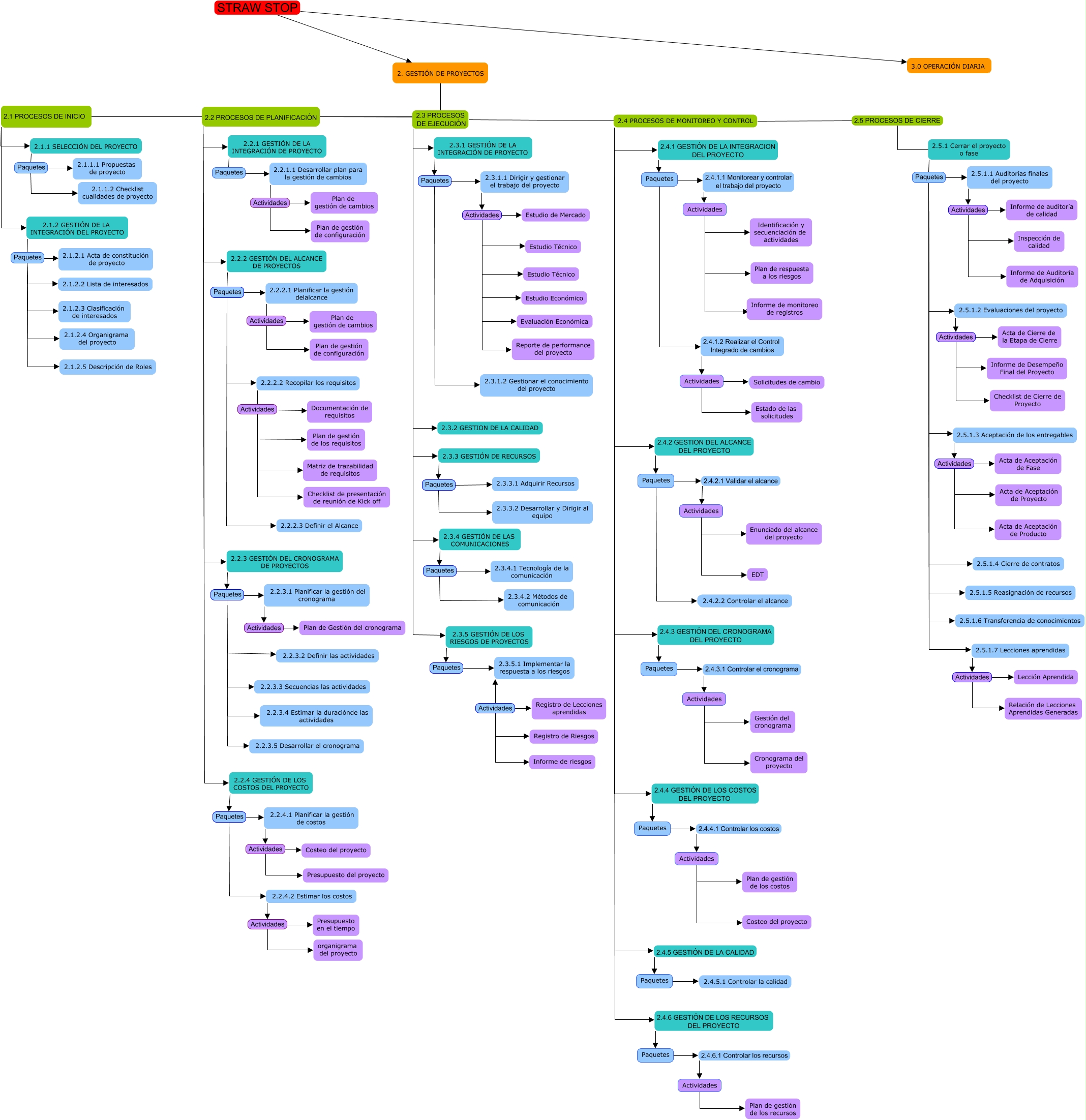Este Cmap, tiene información relacionada con: EDT de GESTIÓN STRAW STOP, 2. GESTIÓN DE PROYECTOS 2.2 PROCESOS DE PLANIFICACIÓN 2.2.1 GESTIÓN DE LA INTEGRACIÓN DE PROYECTO, 2.4 PROCESOS DE MONITOREO Y CONTROL 2.4.4 GESTIÓN DE LOS COSTOS DEL PROYECTO Paquetes, Paquetes 2.4.1.2 Realizar el Control Integrado de cambios Actividades, 2.5.1 Cerrar el proyecto o fase Paquetes 2.5.1.2 Evaluaciones del proyecto, Actividades ???? Plan de gestión de los costos, 2.2.4.1 Planificar la gestión de costos Actividades Presupuesto del proyecto, 2.2.2.2 Recopilar los requisitos Actividades Documentación de requisitos, 2.1.2 GESTIÓN DE LA INTEGRACIÓN DEL PROYECTO Paquetes 2.1.2.1 Acta de constitución de proyecto, Paquetes 2.4.2.2 Controlar el alcance 2.4.2.2 Controlar el alcance, 2.2.3.1 Planificar la gestión del cronograma Actividades Plan de Gestión del cronograma, 2.1.2 GESTIÓN DE LA INTEGRACIÓN DEL PROYECTO Paquetes 2.1.2.5 Descripción de Roles, 2.3.5 GESTIÓN DE LOS RIESGOS DE PROYECTOS Paquetes 2.3.5.1 Implementar la respuesta a los riesgos, 2.2.2 GESTIÓN DEL ALCANCE DE PROYECTOS Paquetes 2.2.2.1 Planificar la gestión delalcance, 2.5.1.1 Auditorías finales del proyecto Actividades Informe de Auditoría de Adquisición, 2.2.2.2 Recopilar los requisitos Actividades Plan de gestión de los requisitos, Actividades ???? Costeo del proyecto, 2. GESTIÓN DE PROYECTOS 2.3 PROCESOS DE EJECUCIÓN 2.3.5 GESTIÓN DE LOS RIESGOS DE PROYECTOS, 2.5.1 Cerrar el proyecto o fase Paquetes 2.5.1.1 Auditorías finales del proyecto, 2.3.1.1 Dirigir y gestionar el trabajo del proyecto Actividades Estudio Económico, Paquetes 2.4.4.1 Controlar los costos Actividades