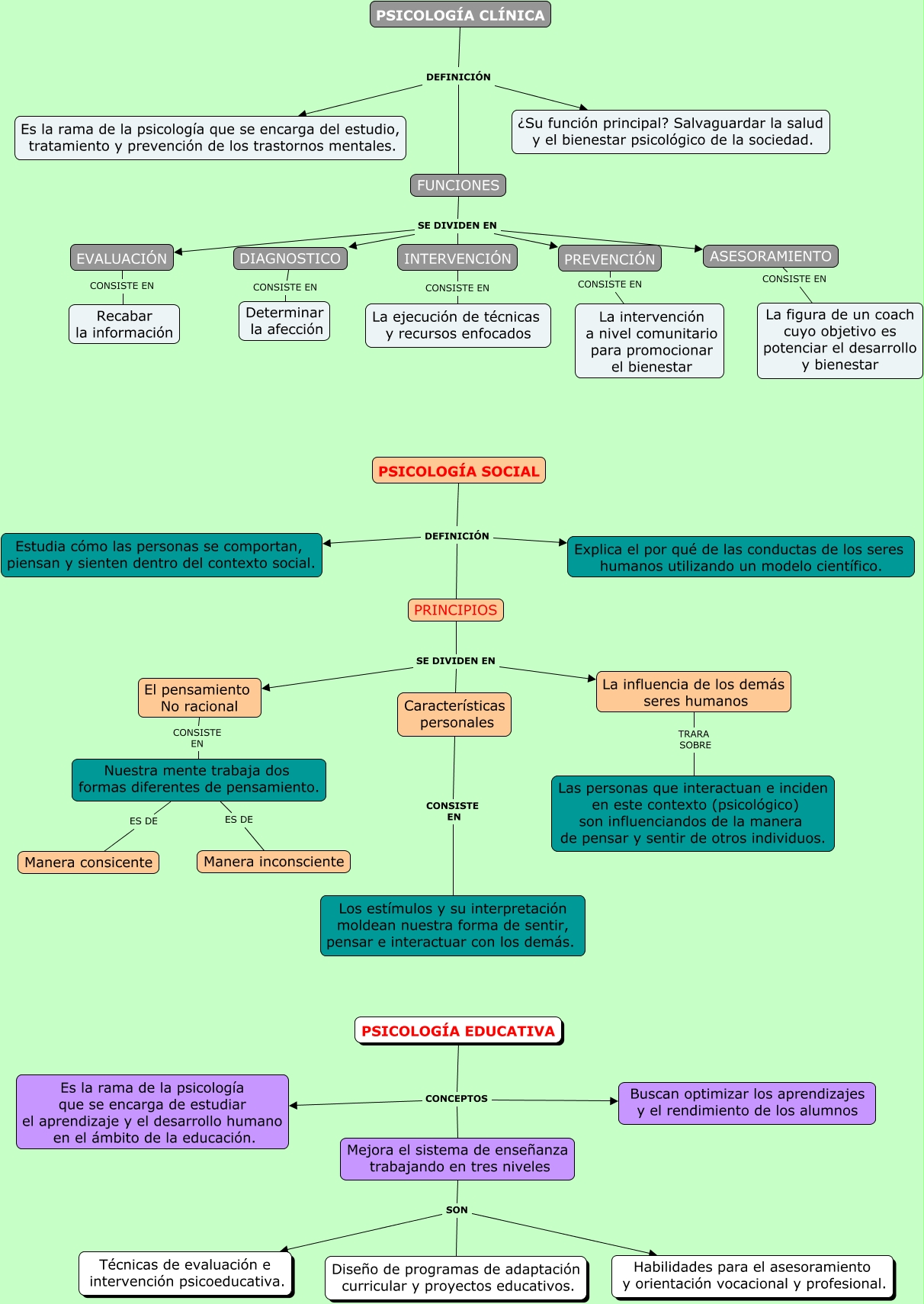 Este Cmap, tiene información relacionada con: Psicología Clinica, PSICOLOGÍA SOCIAL DEFINICIÓN Explica el por qué de las conductas de los seres humanos utilizando un modelo científico., FUNCIONES SE DIVIDEN EN PREVENCIÓN, Mejora el sistema de enseñanza trabajando en tres niveles SON Técnicas de evaluación e intervención psicoeducativa., PSICOLOGÍA CLÍNICA DEFINICIÓN FUNCIONES, PRINCIPIOS SE DIVIDEN EN La influencia de los demás seres humanos, PSICOLOGÍA EDUCATIVA CONCEPTOS Mejora el sistema de enseñanza trabajando en tres niveles, PREVENCIÓN CONSISTE EN La intervención a nivel comunitario para promocionar el bienestar, FUNCIONES SE DIVIDEN EN INTERVENCIÓN, DIAGNOSTICO CONSISTE EN Determinar la afección, ASESORAMIENTO CONSISTE EN La figura de un coach cuyo objetivo es potenciar el desarrollo y bienestar, EVALUACIÓN CONSISTE EN Recabar la información, Mejora el sistema de enseñanza trabajando en tres niveles SON Diseño de programas de adaptación curricular y proyectos educativos., PRINCIPIOS SE DIVIDEN EN Características personales, FUNCIONES SE DIVIDEN EN EVALUACIÓN, PSICOLOGÍA SOCIAL DEFINICIÓN PRINCIPIOS, FUNCIONES SE DIVIDEN EN ASESORAMIENTO, PRINCIPIOS SE DIVIDEN EN El pensamiento No racional, PSICOLOGÍA EDUCATIVA CONCEPTOS Buscan optimizar los aprendizajes y el rendimiento de los alumnos, PSICOLOGÍA CLÍNICA DEFINICIÓN ¿Su función principal? Salvaguardar la salud y el bienestar psicológico de la sociedad., INTERVENCIÓN CONSISTE EN La ejecución de técnicas y recursos enfocados