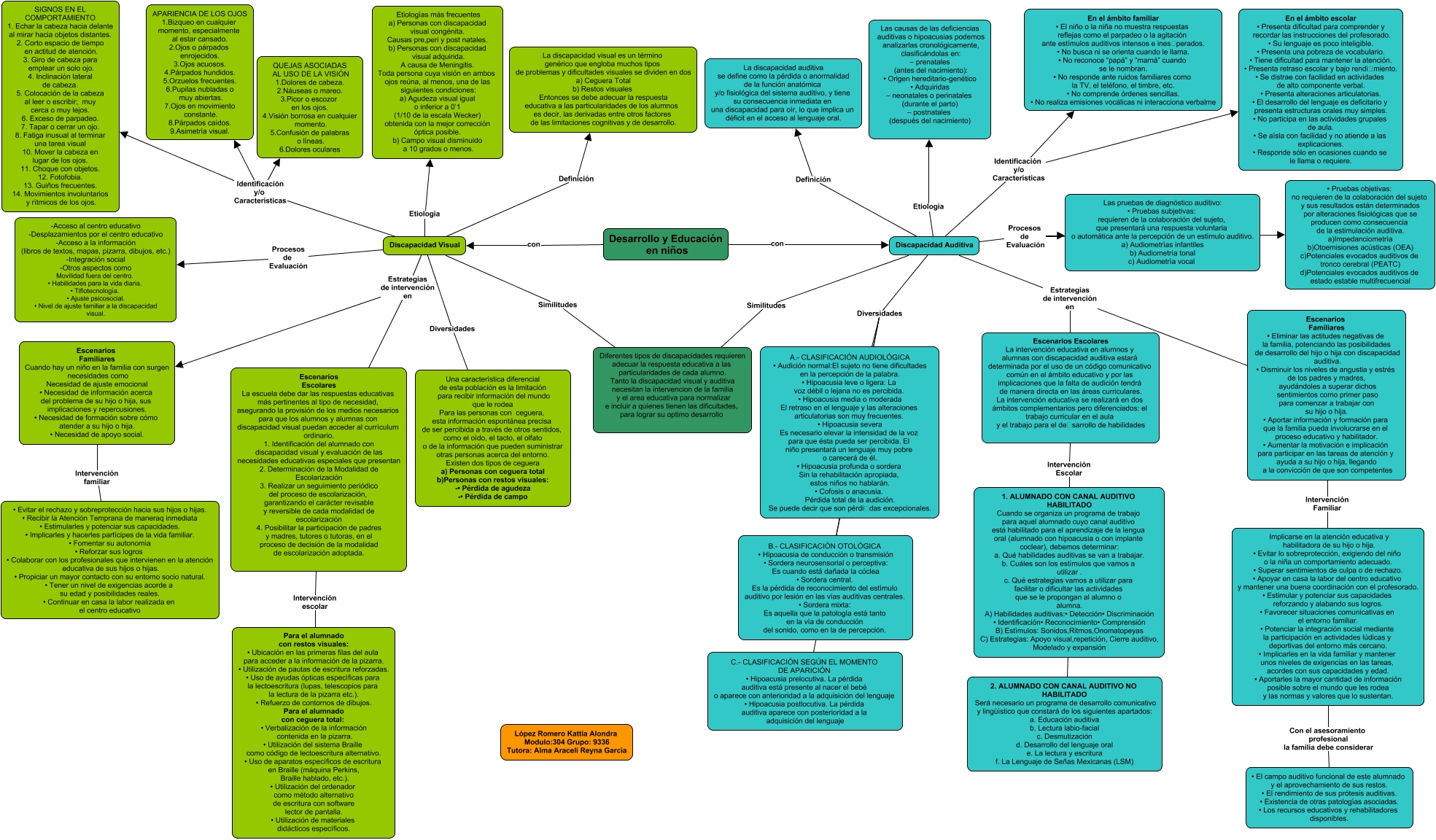 Este Cmap, tiene información relacionada con: Discapacidad VyA, Desarrollo y Educación en niños con Discapacidad Visual, Discapacidad Auditiva Estrategias de intervención en Escenarios Familiares • Eliminar las actitudes negativas de la familia, potenciando las posibilidades de desarrollo del hijo o hija con discapacidad auditiva. • Disminuir los niveles de angustia y estrés de los padres y madres, ayudándoles a superar dichos sentimientos como primer paso para comenzar a trabajar con su hijo o hija. • Aportar información y formación para que la familia pueda involucrarse en el proceso educativo y habilitador. • Aumentar la motivación e implicación para participar en las tareas de atención y ayuda a su hijo o hija, llegando a la convicción de que son competentes, Discapacidad Visual Estrategias de intervención en Escenarios Familiares Cuando hay un niño en la familia con surgen necesidades como Necesidad de ajuste emocional • Necesidad de información acerca del problema de su hijo o hija, sus implicaciones y repercusiones. • Necesidad de formación sobre cómo atender a su hijo o hija. • Necesidad de apoyo social., 1. ALUMNADO CON CANAL AUDITIVO HABILITADO Cuando se organiza un programa de trabajo para aquel alumnado cuyo canal auditivo está habilitado para el aprendizaje de la lengua oral (alumnado con hipoacusia o con implante coclear), debemos determinar: a. Qué habilidades auditivas se van a trabajar. b. Cuáles son los estímulos que vamos a utilizar . c. Qué estrategias vamos a utilizar para facilitar o dificultar las actividades que se le propongan al alumno o alumna. A) Habilidades auditivas:• Detección• Discriminación • Identificación• Reconocimiento• Comprensión B) Estímulos: Sonidos,Ritmos,Onomatopeyas C) Estrategias: Apoyo visual,repetición, Cierre auditivo, Modelado y expansión ???? 2. ALUMNADO CON CANAL AUDITIVO NO HABILITADO Será necesario un programa de desarrollo comunicativo y lingüístico que constará de los siguientes apartados: a. Educación auditiva b. Lectura labio-facial c. Desmutización d. Desarrollo del lenguaje oral e. La lectura y escritura f. La Lenguaje de Señas Mexicanas (LSM), Discapacidad Auditiva Definición La discapacidad auditiva se define como la pérdida o anormalidad de la función anatómica y/o fisiológica del sistema auditivo, y tiene su consecuencia inmediata en una discapacidad para oír, lo que implica un déficit en el acceso al lenguaje oral., Discapacidad Visual Identificación y/o Características QUEJAS ASOCIADAS AL USO DE LA VISIÓN 1.Dolores de cabeza. 2.Náuseas o mareo. 3.Picor o escozor en los ojos. 4.Visión borrosa en cualquier momento. 5.Confusión de palabras o líneas. 6.Dolores oculares, Discapacidad Auditiva Similitudes Diferentes tipos de discapacidades requieren adecuar la respuesta educativa a las particularidades de cada alumno. Tanto la discapacidad visual y auditiva necesitan la intervencion de la familia y el area educativa para normalizar e incluir a quienes tienen las dificultades, para lograr su optimo desarrollo, Escenarios Escolares La escuela debe dar las respuestas educativas más pertinentes al tipo de necesidad, asegurando la provisión de los medios necesarios para que los alumnos y alumnas con discapacidad visual puedan acceder al currículum ordinario. 1. Identificación del alumnado con discapacidad visual y evaluación de las necesidades educativas especiales que presentan 2. Determinación de la Modalidad de Escolarización 3. Realizar un seguimiento periódico del proceso de escolarización, garantizando el carácter revisable y reversible de cada modalidad de escolarización 4. Posibilitar la participación de padres y madres, tutores o tutoras, en el proceso de decisión de la modalidad de escolarización adoptada. Intervención escolar Para el alumnado con restos visuales: • Ubicación en las primeras filas del aula para acceder a la información de la pizarra. • Utilización de pautas de escritura reforzadas. • Uso de ayudas ópticas específicas para la lectoescritura (lupas, telescopios para la lectura de la pizarra etc.). • Refuerzo de contornos de dibujos. Para el alumnado con ceguera total: • Verbalización de la información contenida en la pizarra. • Utilización del sistema Braille como código de lectoescritura alternativo. • Uso de aparatos específicos de escritura en Braille (máquina Perkins, Braille hablado, etc.). • Utilización del ordenador como método alternativo de escritura con software lector de pantalla. • Utilización de materiales didácticos específicos., Discapacidad Auditiva Diversidades B.- CLASIFICACIÓN OTOLÓGICA • Hipoacusia de conducción o transmisión • Sordera neurosensorial o perceptiva: Es cuando está dañada la cóclea • Sordera central. Es la pérdida de reconocimiento del estímulo auditivo por lesión en las vías auditivas centrales. • Sordera mixta: Es aquella que la patología está tanto en la vía de conducción del sonido, como en la de percepción., Implicarse en la atención educativa y habilitadora de su hijo o hija. • Evitar lo sobreprotección, exigiendo del niño o la niña un comportamiento adecuado. • Superar sentimientos de culpa o de rechazo. • Apoyar en casa la labor del centro educativo y mantener una buena coordinación con el profesorado. • Estimular y potenciar sus capacidades reforzando y alabando sus logros. • Favorecer situaciones comunicativas en el entorno familiar. • Potenciar la integración social mediante la participación en actividades lúdicas y deportivas del entorno más cercano. • Implicarles en la vida familiar y mantener unos niveles de exigencias en las tareas, acordes con sus capacidades y edad. • Aportarles la mayor cantidad de información posible sobre el mundo que les rodea y las normas y valores que lo sustentan. Con el asesoramiento profesional la familia debe considerar • El campo auditivo funcional de este alum