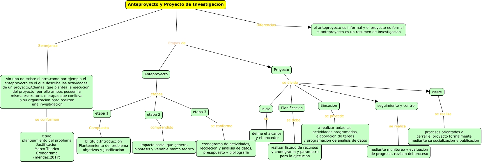 Este Cmap, tiene información relacionada con: Proyecto-Anteproyecto, cierre se realiza procesos orientados a cerrar el proyecto formalmente mediante su socializacion y publicacion, Anteproyecto etapas etapa 3, sin uno no existe el otro,como por ejemplo el anteproyecto es el que describe las actividades de un proyecto,Ademas que plantea la ejecucion del proyecto, por ello ambos poseen la misma esctrutura. o etapas que conlleva a su organizacion para realizar una investigacion se conforman titulo planteamiento del problema Justificacion Marco Teorico Cronograma (mendez,2017), Ejecucion se procede a realizar todas las actividades programadas, elaboracion de tareas y programacion de analisis de datos, inicio se define el alcance y el proceder, Proyecto se divide inicio, Proyecto se divide Planificacion, Proyecto se divide cierre, etapa 3 se conforma cronograma de actividades, recolecion y analisis de datos, presupuesto y bibliografia, Anteproyecto etapas etapa 2, Anteproyecto y Proyecto de Investigacion Etapas de Proyecto, etapa 2 comprendido impacto social que genera, hipotesis y variable,marco teorico, seguimiento y control se realiza mediante monitoreo y evaluacion de progreso, revison del proceso, Proyecto se divide Ejecucion, Anteproyecto etapas etapa 1, Planificacion se debe realizar listado de recursos y cronograma y parametro para la ejecucion, Proyecto se divide seguimiento y control, Anteproyecto y Proyecto de Investigacion Etapas de Anteproyecto, Anteproyecto y Proyecto de Investigacion Diferencias el anteproyecto es informal y el proyecto es formal el anteproyecto es un resumen de investigacion, etapa 1 Compuesta El titulo,Introduccion Planteamiento del problema objetivos y justificacion