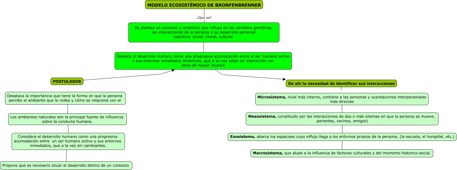Este Cmap, tiene información relacionada con: Modelo Ecosistemico, Destaca el desarrollo humano como una progresiva acomodación entre el ser humano activo y sus entornos inmediatos dinámicos, qué a su vez están en interacción con otros de mayor alcancé . De ahí la necesidad de identificar sus interacciones, Los ambientes naturales son la principal fuente de influencia sobre la conducta humana. . Considera el desarrollo humano como una progresiva acomodación entre un ser humano activo y sus entornos inmediatos, que a la vez sin cambiantes., Desataca la importancia que tiene la forma en que la persona percibe el ambiente que le rodea y cómo se relaciona con el Los ambientes naturales son la principal fuente de influencia sobre la conducta humana., Mesosistema, constituido por las interacciones de dos o más sitemas en que la persona se mueve, parientes, vecinos, amigos) . Exosistema, abarca los espacioes cuyo influjo llega a los entornos propios de la persona, (la escuela, el horspital, etc.), MODELO ECOSISTÉMICO DE BRONFENBRENNER ¿Qué es? Se plantea un contexto o ambiente que influye en las variables genéticas, las interacciones de la persona y su desarrollo personal cognitivo, social, moral, cultural., POSTULADOS . Destaca el desarrollo humano como una progresiva acomodación entre el ser humano activo y sus entornos inmediatos dinámicos, qué a su vez están en interacción con otros de mayor alcancé, Considera el desarrollo humano como una progresiva acomodación entre un ser humano activo y sus entornos inmediatos, que a la vez sin cambiantes. . Propone qué es necesario situar el desarrollo dentro de un contexto, Se plantea un contexto o ambiente que influye en las variables genéticas, las interacciones de la persona y su desarrollo personal cognitivo, social, moral, cultural. . Destaca el desarrollo humano como una progresiva acomodación entre el ser humano activo y sus entornos inmediatos dinámicos, qué a su vez están en interacción con otros de mayor alcancé, Microsistema, nivel más interno, contiene a las personas y susrelaciones interpersonales más directas . Mesosistema, constituido por las interacciones de dos o más sitemas en que la persona se mueve, parientes, vecinos, amigos), Exosistema, abarca los espacioes cuyo influjo llega a los entornos propios de la persona, (la escuela, el horspital, etc.) . Macrosistema, que alude a la influencia de factores culturales y del momento historico-social., De ahí la necesidad de identificar sus interacciones Microsistema, nivel más interno, contiene a las personas y susrelaciones interpersonales más directas