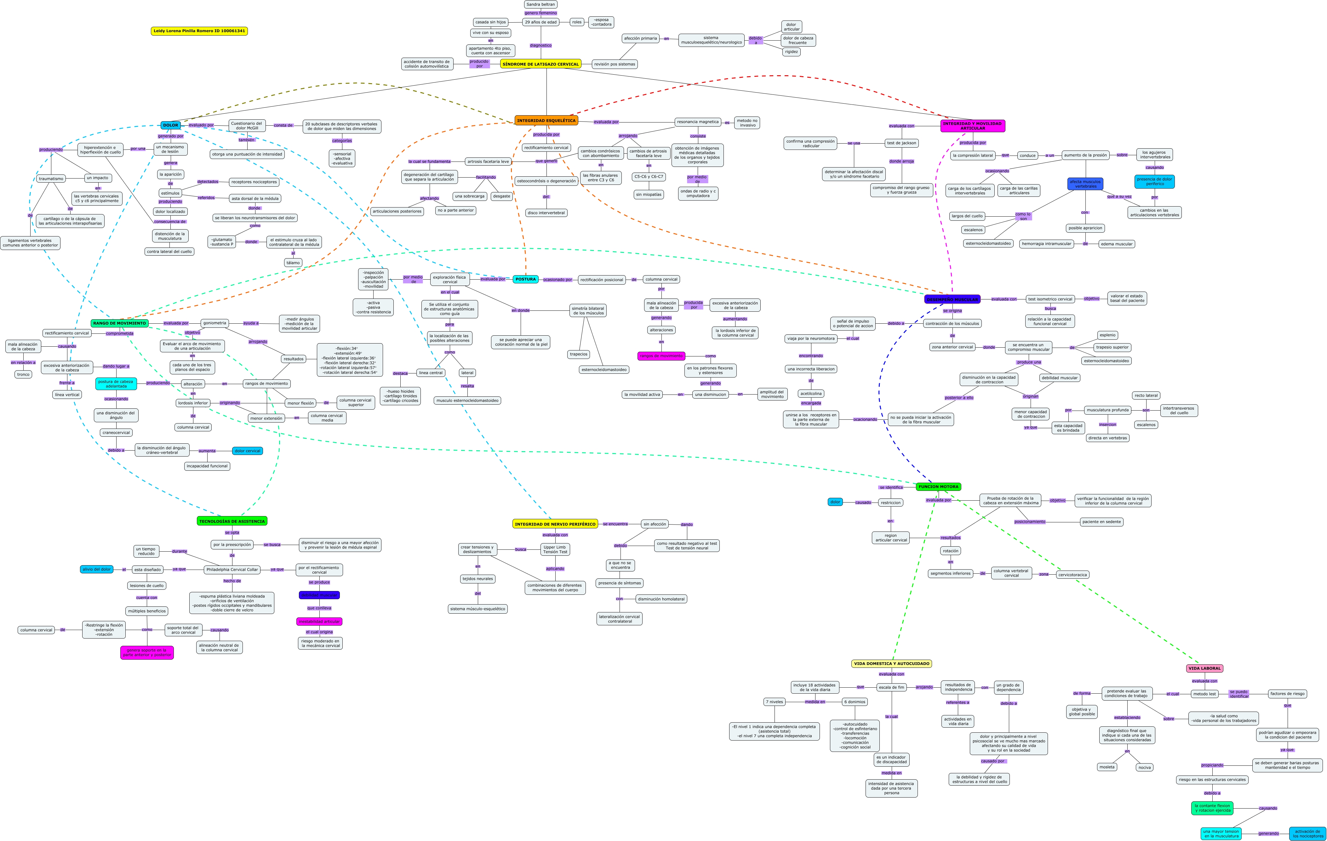 Este Cmap, tiene información relacionada con: patokine sindrime latigazo, hiperextención e hiperflexión de cuello produciendo un impacto, una mayor tension en la musculatura generando activación de los nociceptores, resultados de independencia con un grado de dependencia, unirse a los receptores en la parte externa de la fibra muscular ocacionando no se pueda iniciar la activación de la fibra muscular, cambios condrósicos con abombamiento en las fibras anulares entre C3 y C6, lordosis inferior originando menor flexión, disminución en la capacidad de contraccion originan menor capacidad de contraccion, estímulos detectados receptores nociceptores, crear tensiones y deslizamientos en tejidos neurales, afecta musculos vertebrales como lo son escalenos, resonancia magnetica consiste obtención de imágenes médicas detalladas de los organos y tejidos corporales, test de jackson donde arroja compromiso del rango grueso y fuerza grueza, escala de fim arojando resultados de independencia, C5-C6 y C6-C7 ???? sin miopatías, rectificamiento cervical causando excesiva anteriorización de la cabeza, menor capacidad de contraccion ya que esta capacidad es brindada, Upper Limb Tensión Test busca crear tensiones y deslizamientos, podrían agudizar o empeorara la condicion del paciente ya que se deben generar barias posturas mantenidad e el tiempo, INTEGRIDAD ESQUELÉTICA ???? DESEMPEÑO MUSCULAR, se encuentra un compromiso muscular de esplenio