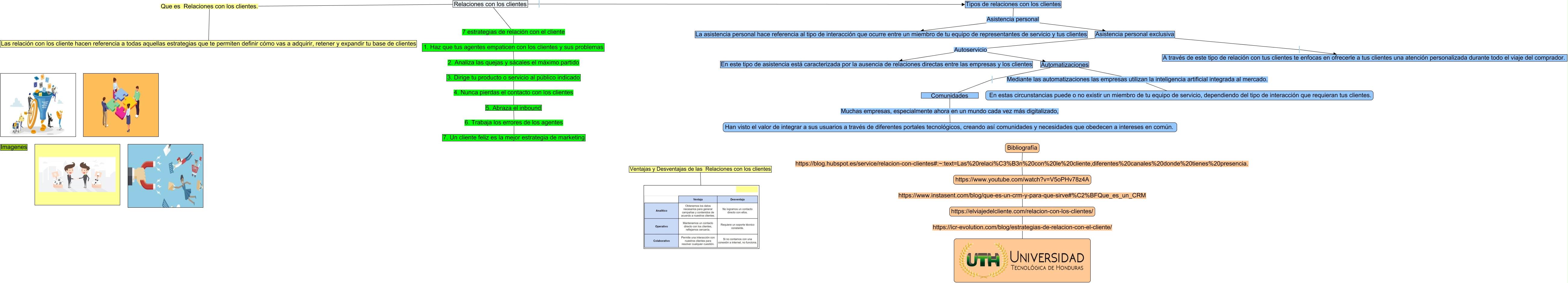 This Concept Map, created with IHMC CmapTools, has information related to: Relaciones con los clientes, Asistencia personal exclusiva A través de este tipo de relación con tus clientes te enfocas en ofrecerle a tus clientes una atención personalizada durante todo el viaje del comprador., Relaciones con los clientes Que es Relaciones con los clientes. Las relación con los cliente hacen referencia a todas aquellas estrategias que te permiten definir cómo vas a adquirir, retener y expandir tu base de clientes, Tipos de relaciones con los clientes Asistencia personal Asistencia personal exclusiva, https://www.youtube.com/watch?v=V5oPHv78z4A https://www.instasent.com/blog/que-es-un-crm-y-para-que-sirve#%C2%BFQue_es_un_CRM https://elviajedelcliente.com/relacion-con-los-clientes/, Asistencia personal exclusiva Autoservicio Automatizaciones, 1. Haz que tus agentes empaticen con los clientes y sus problemas 2. Analiza las quejas y sácales el máximo partido 3. Dirige tu producto o servicio al público indicado, Relaciones con los clientes Tipos de relaciones con los clientes, 3. Dirige tu producto o servicio al público indicado 4. Nunca pierdas el contacto con los clientes 5. Abraza el inbound, Automatizaciones Mediante las automatizaciones las empresas utilizan la inteligencia artificial integrada al mercado. En estas circunstancias puede o no existir un miembro de tu equipo de servicio, dependiendo del tipo de interacción que requieran tus clientes., https://elviajedelcliente.com/relacion-con-los-clientes/ https://icr-evolution.com/blog/estrategias-de-relacion-con-el-cliente/, Ventajas y Desventajas de las Relaciones con los clientes ????, Bibliografía https://blog.hubspot.es/service/relacion-con-clientes#:~:text=Las%20relaci%C3%B3n%20con%20le%20cliente,diferentes%20canales%20donde%20tienes%20presencia. https://www.youtube.com/watch?v=V5oPHv78z4A, 5. Abraza el inbound 6. Trabaja los errores de los agentes 7. Un cliente feliz es la mejor estrategia de marketing, Asistencia personal exclusiva Autoservicio En este tipo de asistencia está caracterizada por la ausencia de relaciones directas entre las empresas y los clientes, Automatizaciones Comunidades, Relaciones con los clientes 7 estrategias de relación con el cliente 1. Haz que tus agentes empaticen con los clientes y sus problemas, Tipos de relaciones con los clientes Asistencia personal La asistencia personal hace referencia al tipo de interacción que ocurre entre un miembro de tu equipo de representantes de servicio y tus clientes, Comunidades Muchas empresas, especialmente ahora en un mundo cada vez más digitalizado, Han visto el valor de integrar a sus usuarios a través de diferentes portales tecnológicos, creando así comunidades y necesidades que obedecen a intereses en común.