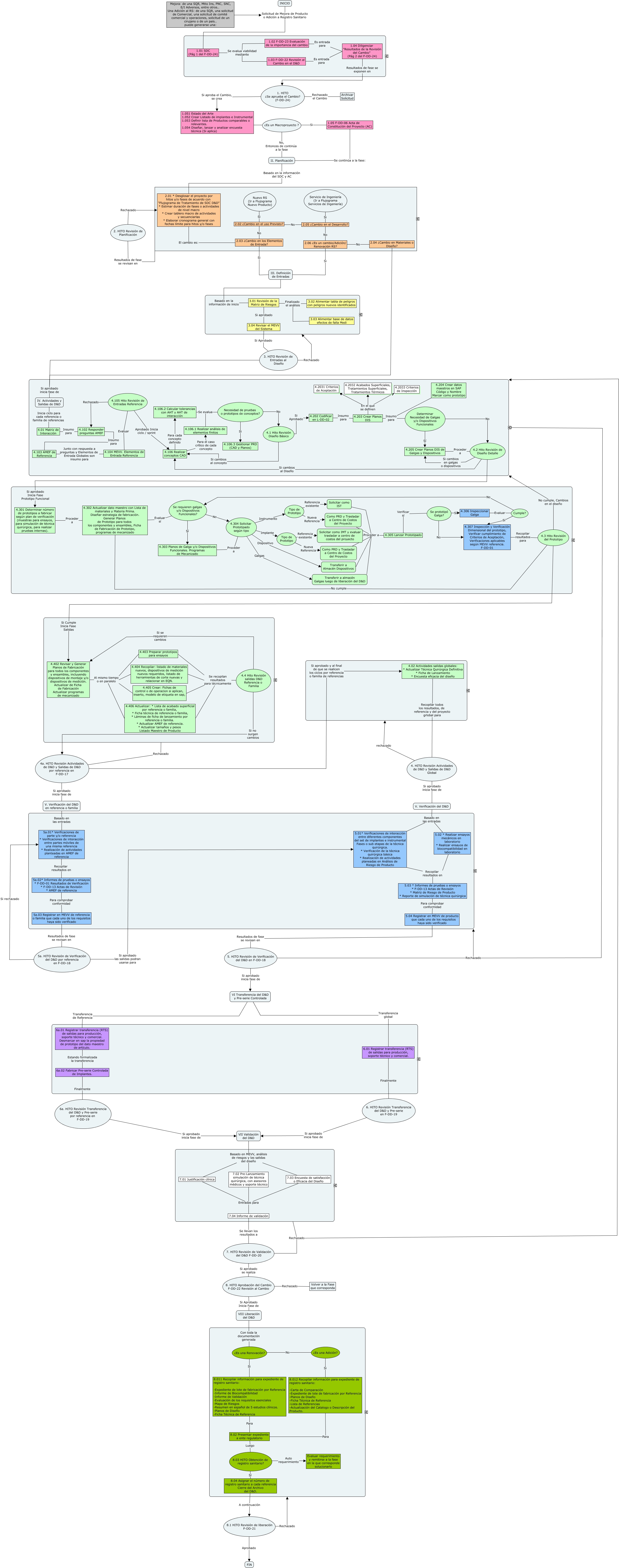 Este Cmap, tiene información relacionada con: Flujograma Proyecto Mejora D&D-04, Como PRD y Trasladar a Centro de Costos del Proyecto Proceder a 4.305 Lanzar Prototipado, Se requieren galgas y/o Dispositivos Funcionales? Sí 4.303 Planos de Galga y/o Dispositivos Funcionales. Programas de Mecanizado, 4.102 Responder preguntas AMEF Insumo para 4.103 AMEF de Referencia, 4.2 Hito Revisión de Diseño Detalle Si cambios al Diseño 4.106 Realizar conceptos CAD, 4.203 Crear Planos DIS En el que se definen 4.2031 Criterios de Aceptación, 4.105 Hito Revisión de Entradas Referencia Rechazado 4.102 Responder preguntas AMEF, 1.03 F-DD-22 Revisión al Cambio en el D&D Es entrada para 1.04 Diligenciar "Resultados de la Revisión del Cambio" (Pág 2 del F-DD-24), 4.203 Crear Planos DIS En el que se definen 4.2033 Criterios de Inspección, 2.05 ¿Cambio en el Desarrollo? No 2.06 ¿Es un cambio/Adición/ Renovación RS?, 1.05 F-DD-06 Acta de Constitución del Proyecto (AC) Si ¿Es un Macroproyecto ?, Solicitar como IST Proceder a 4.305 Lanzar Prototipado, 4.205 Crear Planos DIS de Galgas y Dispositivos Proceder a 4.2 Hito Revisión de Diseño Detalle, 2.06 ¿Es un cambio/Adición/ Renovación RS? Si III. Definición de Entradas, Se prototipó Galga? No 4.307 Inspección y Verificación Dimensional del prototipo, Verificar cumplimiento de Criterios de Aceptación, Verificaciones aplicables según MEVV referencia. F-DD-01, 1.02 F-DD-23 Evaluación de la importancia del cambio Es entrada para 1.04 Diligenciar "Resultados de la Revisión del Cambio" (Pág 2 del F-DD-24), 5. HITO Revisión de Verificación del D&D en F-DD-18 Rechazado Diseño Básico y de Detalle, 4.304 Solicitar Prototipado según tipo Dispositivo Transferir a Almacén Dispositivos, 8.1 HITO Revisión de liberación F-DD-21 Rechazado ????, 7.03 Encuesta de satisfacción o Eficacia del Diseño Entradas para 7.04 Informe de validación, 2.04 ¿Cambio en Materiales o Diseño? No 2.06 ¿Es un cambio/Adición/ Renovación RS?