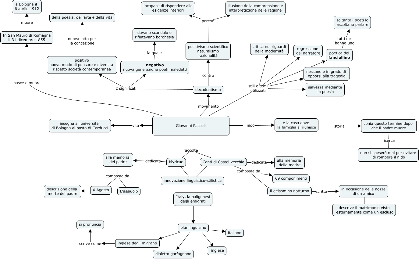 Questa Cmap, creata con IHMC CmapTools, contiene informazioni relative a: Pascoli poetica, innovazione linguistico-stilistica ???? Italy, la paligenesi degli emigrati, Giovanni Pascoli movimento decadentismo, positivismo scientifico naturalismo razionalità perché illusione della comprensione e interpretazione delle ragione, Giovanni Pascoli stili e temi utilizzati poetica del fanciullino, Myricae dedicata alla memoria del padre, positivismo scientifico naturalismo razionalità perché incapace di rispondere alle esigenze interiori, decadentismo 2 significati positivo nuovo modo di pensare e diversità rispetto società contemporanea, alla memoria del padre composta da L'assiuolo, Canti di Castel vecchio dedicata alla memoria della madre, inglese degli migranti scrive come si pronuncia, plurilinguismo ???? inglese degli migranti, Giovanni Pascoli nasce e muore In San Mauro di Romagna il 31 dicembre 1855, In San Mauro di Romagna il 31 dicembre 1855 muore a Bologna il 6 aprile 1912, plurilinguismo ???? italiano, è la casa dove la famiglia si riunisce storia conia questo termine dopo che il padre muore, in occasione delle nozze di un amico ???? descrive il matrimonio visto esternamente come un escluso, Giovanni Pascoli raccolte Canti di Castel vecchio, decadentismo 2 significati negativo nuova generazione poeti maledetti, Italy, la paligenesi degli emigrati ???? plurilinguismo, Giovanni Pascoli raccolte Myricae