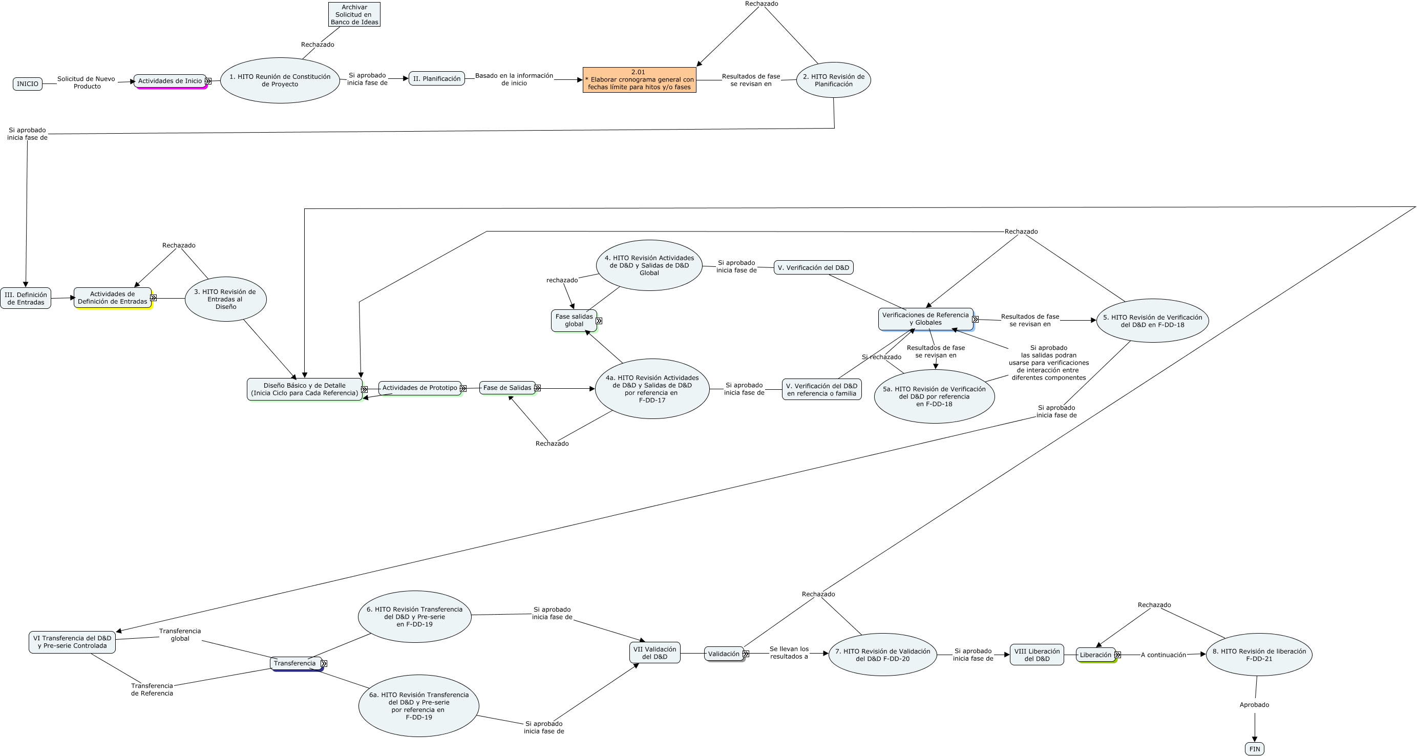 Este Cmap, tiene información relacionada con: Flujograma Proyecto Innovación, 4a. HITO Revisión Actividades de D&D y Salidas de D&D por referencia en F-DD-17 Rechazado Fase de Salidas, Como PRD y Trasladar a Centro de Costos del Proyecto Proceder a 4.305 Lanzar Prototipado, 5. HITO Revisión de Verificación del D&D en F-DD-18 Si aprobado inicia fase de VI Transferencia del D&D y Pre-serie Controlada, 5a.02* Informes de pruebas o ensayos * F-DD-01 Resultados de Verificación * F-DD-13 Actas de Revisión * AMEF de referencia Para comprobar conformidad 5a.03 Registrar en MEVV de referencia o familia que cada uno de los requisitos haya sido verificado, 3.05 Realizar la evaluación del riesgo y plantear controles Finalizado el análisis 3.08Alimentar base de datos efectos de falla Medi, V. Verificación del D&D en referencia o familia Basado en las entradas 5a.01* Verificaciones de parte y/o referencia * Verificaciones de interacción entre partes móviles de una misma referencia * Realización de actividades planteadas en AMEF de referencia, 5. HITO Revisión de Verificación del D&D en F-DD-18 Rechazado Verificaciones de Referencia y Globales, Necesidad de pruebas o prototipos de conceptos? No 4.1 Hito Revisión Diseño Básico, VII Validación del D&D Basado en MEVV, análisis de riesgos y las salidas del diseño 7.01 Justificación clínica, 4.203 Crear Planos DIS En el que se definen 4.2032 Acabados Superficiales, Tratamientos Superficiales, Tratamientos Térmicos, 4. HITO Revisión Actividades de D&D y Salidas de D&D Global Si aprobado inicia fase de V. Verificación del D&D, 1.05 Definir lista de productos comparables o relevantes Resultados de fase se exponen en 1. HITO Reunión de Constitución de Proyecto, 4.306 Inspeccionar Galga Evaluar Cumple?, Transferir a Almacén Dispositivos Proceder a 4.305 Lanzar Prototipado, 4a. HITO Revisión Actividades de D&D y Salidas de D&D por referencia en F-DD-17 Si aprobado inicia fase de V. Verificación del D&D en referencia o familia, 8. HITO Revisión de liberación F-DD-21 Rechazado Liberación, IV. Actividades y Salidas de D&D Inicia ciclo para cada referencia o familia de referencias 4.01 Matriz de Interacción, 4.106 Realizar conceptos CAD Para el caso crítico de cada concepto 4.106.1 Realizar análisis de elementos finitos, 4.02 Actividades salidas globales: * Crear Técnica Quirúrgica Definitiva * Crear Dp-DD * Ficha de Lanzamiento * Encuesta eficacia del diseño Recopilar todos los resultados, de referencia y del proyecto grlobal para 4. HITO Revisión Actividades de D&D y Salidas de D&D Global, 1.04 Crear Listado de Implantes e Instrumental A continuación 1.05 Definir lista de productos comparables o relevantes