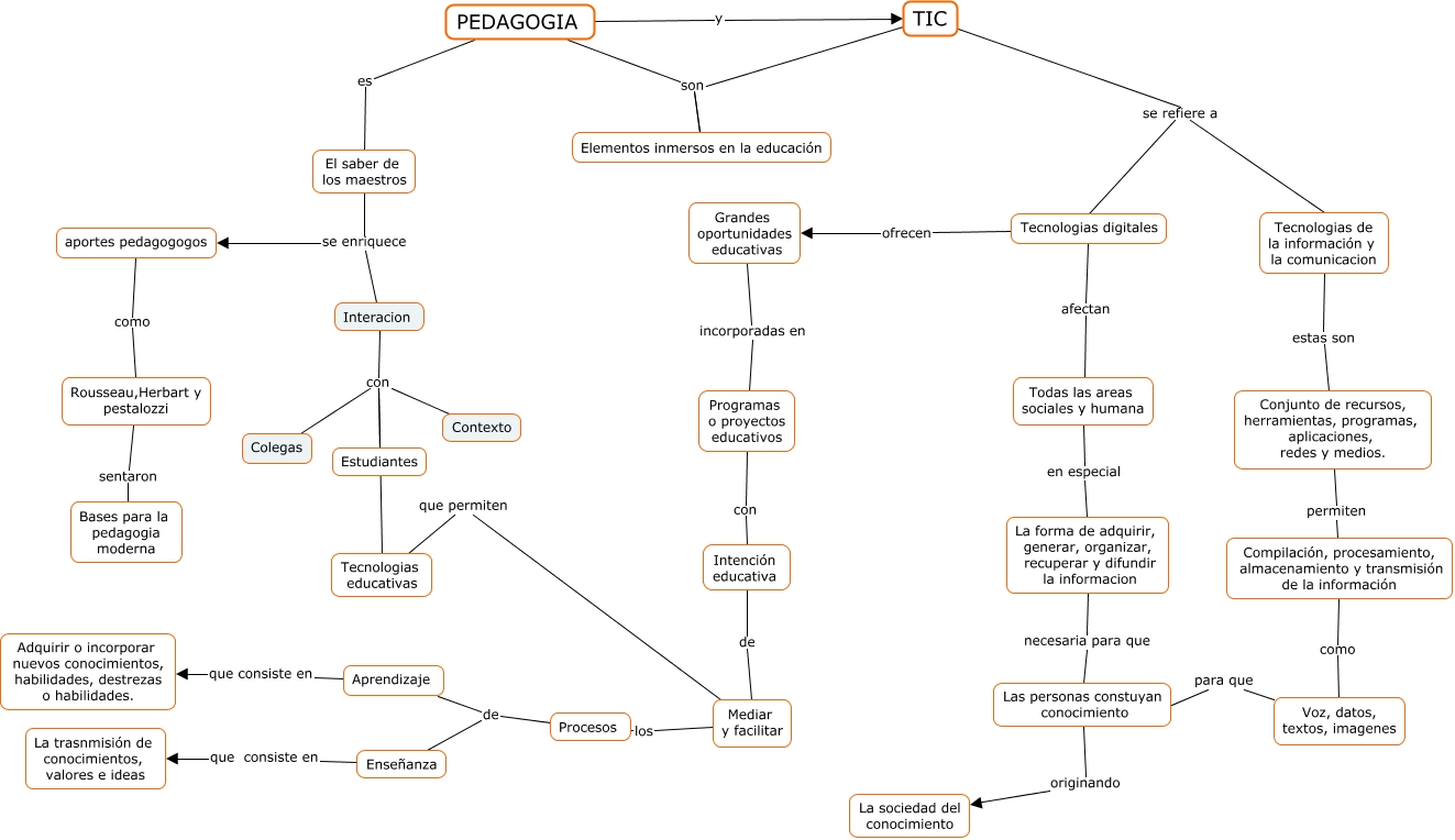 Este Cmap, tiene información relacionada con: PEDAGOGIA Y TIC, Interacion con Colegas, Mediar y facilitar los Procesos, Compilación, procesamiento, almacenamiento y transmisión de la información como Voz, datos, textos, imagenes, Interacion con Tecnologias educativas, PEDAGOGIA es El saber de los maestros, Grandes oportunidades educativas incorporadas en Programas o proyectos educativos, El saber de los maestros se enriquece Interacion, Conjunto de recursos, herramientas, programas, aplicaciones, redes y medios. permiten Compilación, procesamiento, almacenamiento y transmisión de la información, El saber de los maestros se enriquece aportes pedagogogos, aportes pedagogogos como Rousseau,Herbart y pestalozzi, Aprendizaje que consiste en Adquirir o incorporar nuevos conocimientos, habilidades, destrezas o habilidades., TIC se refiere a Tecnologias digitales, Todas las areas sociales y humana en especial La forma de adquirir, generar, organizar, recuperar y difundir la informacion, Tecnologias digitales ofrecen Grandes oportunidades educativas, PEDAGOGIA y TIC, Tecnologias digitales afectan Todas las areas sociales y humana, Intención educativa de Mediar y facilitar, Interacion con Contexto, Tecnologias educativas que permiten Mediar y facilitar, Procesos de Enseñanza